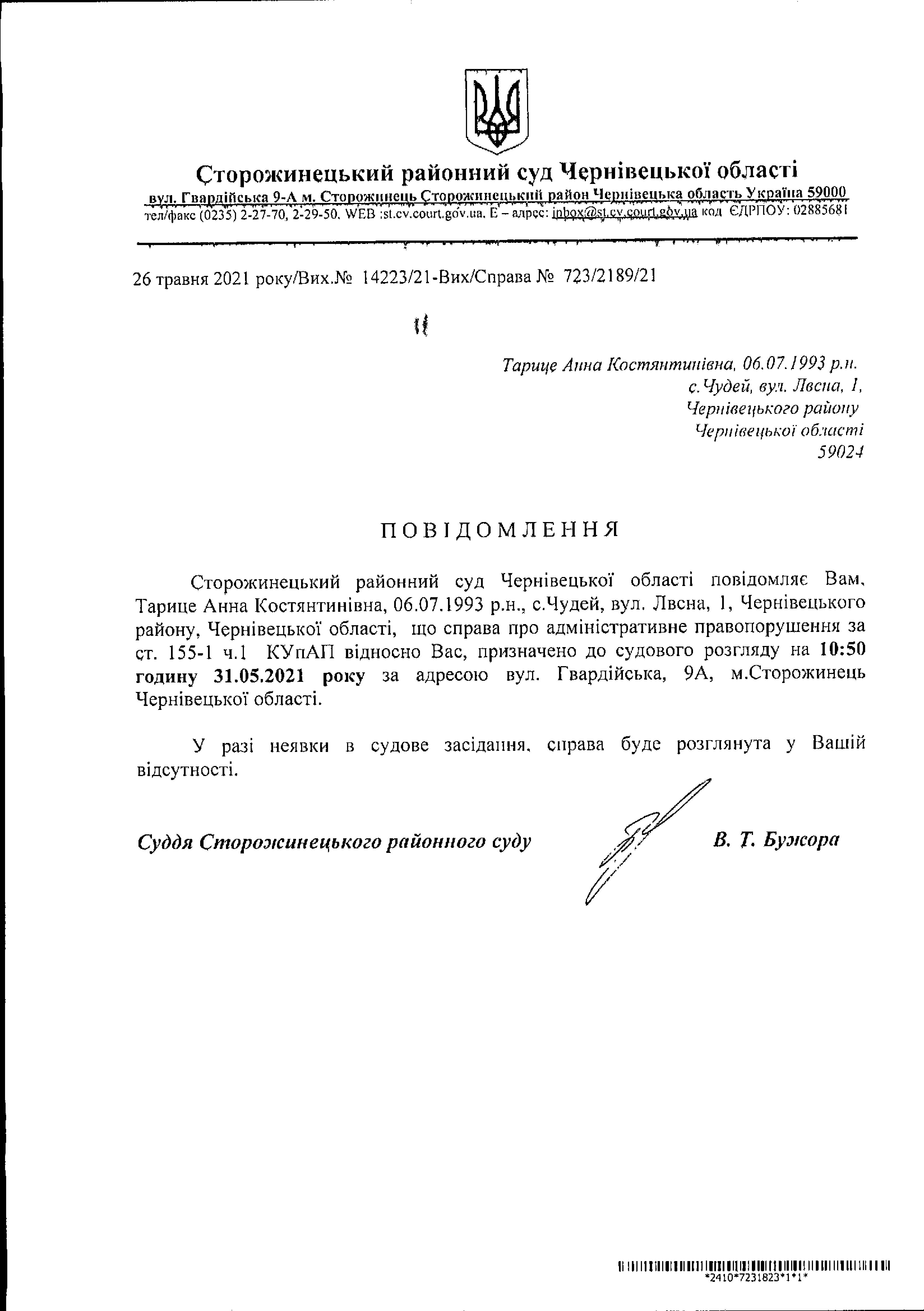 Оголошення про виклик до суду Тарице Анну Костянтинівну