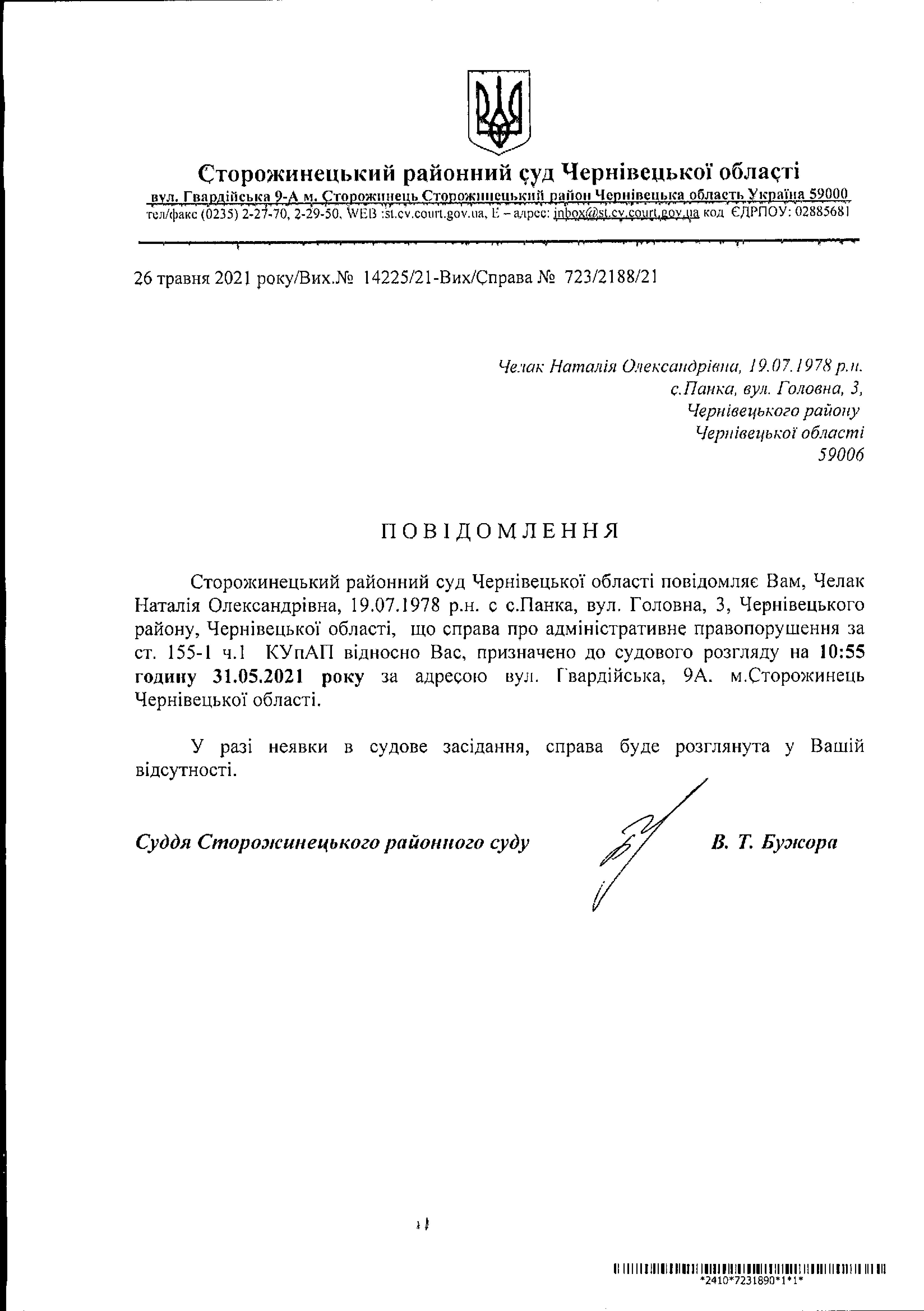 Оголошення про виклик до суду Челак Наталію Олександрівну