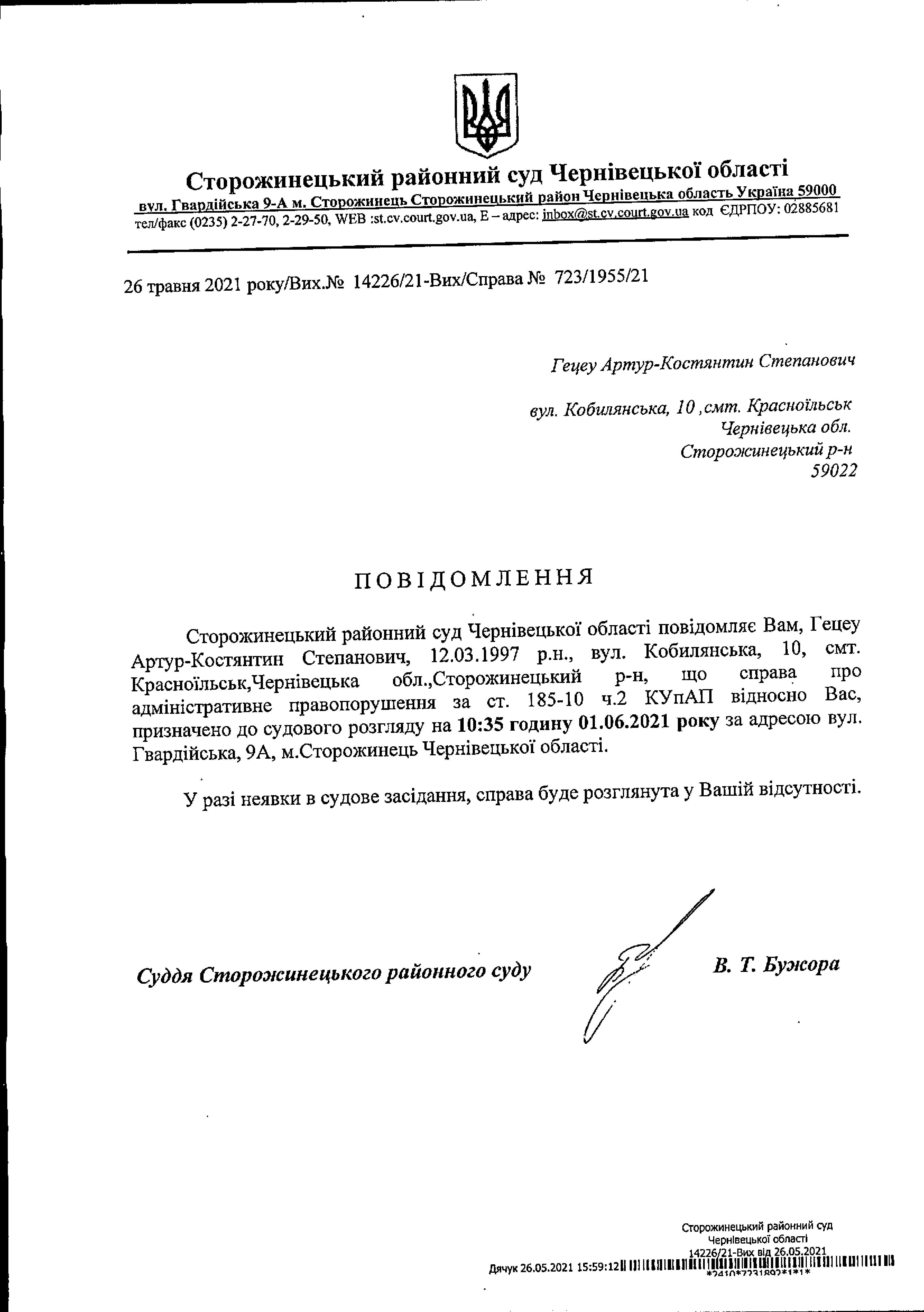 Оголошення про виклик до суду Грецеу Артура-Костянтина Степановича