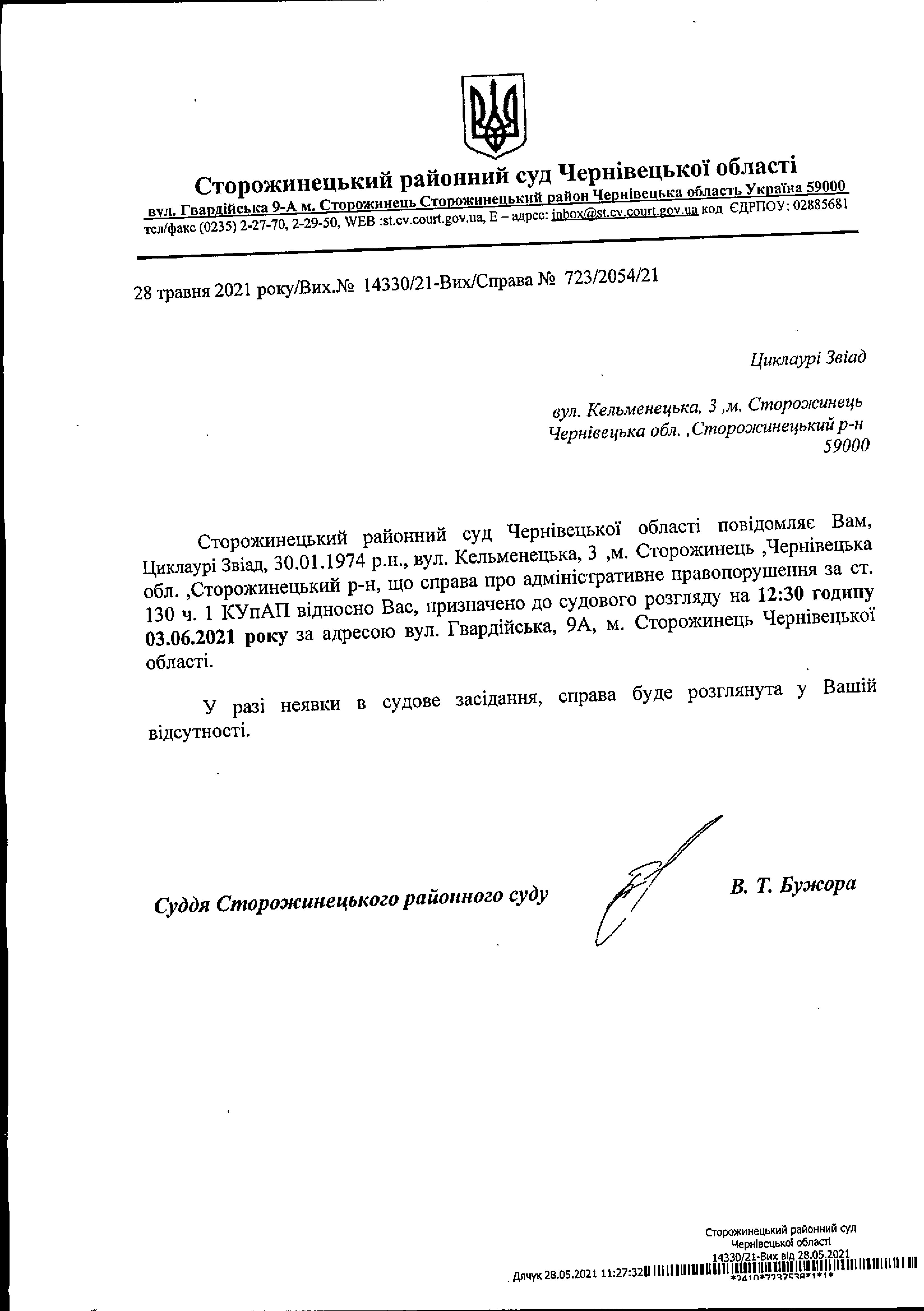 Оголошення про виклик до суду Циклаурі Звіад