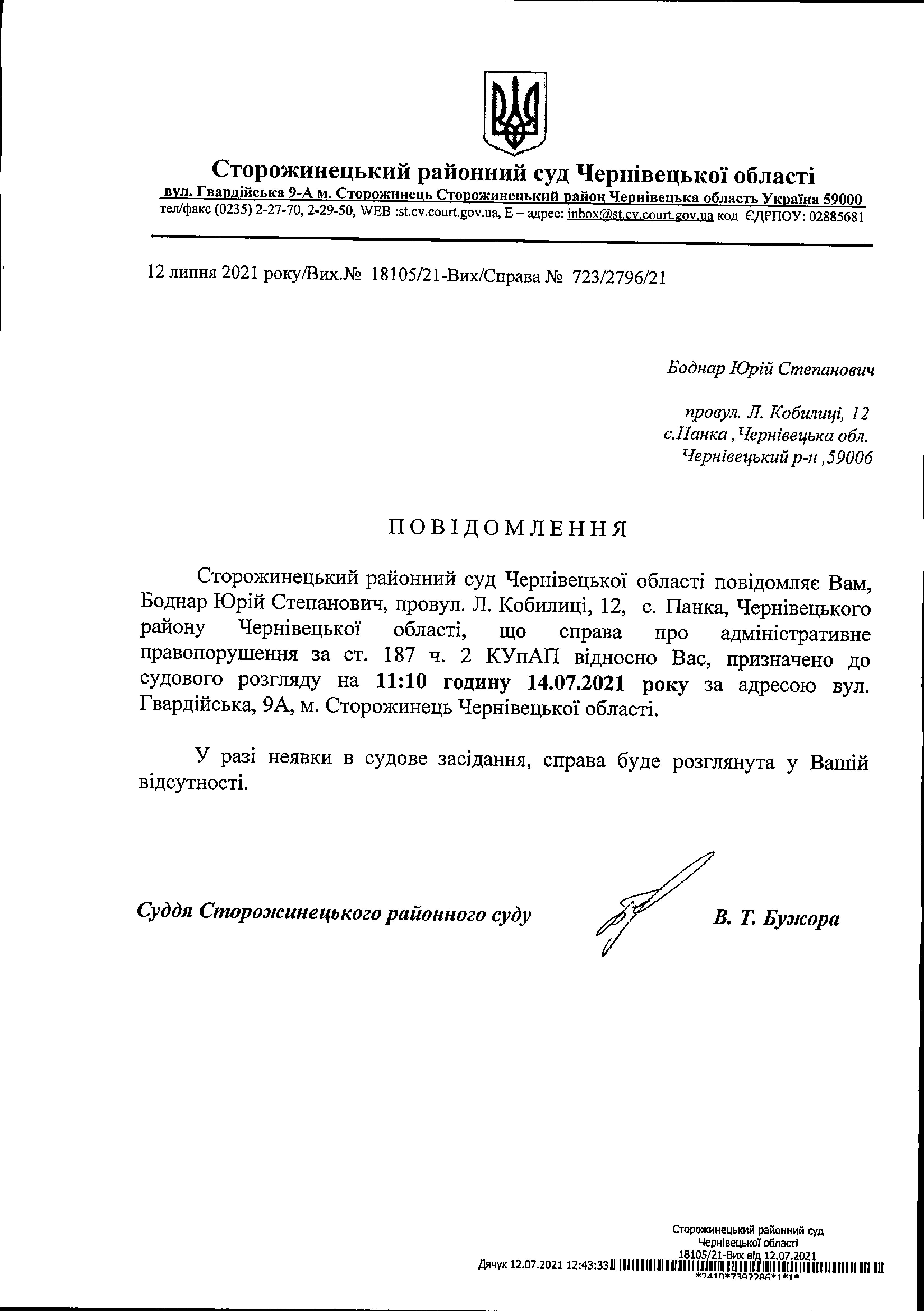 Оголошення про виклик до суду Боднар Юрій Степанович