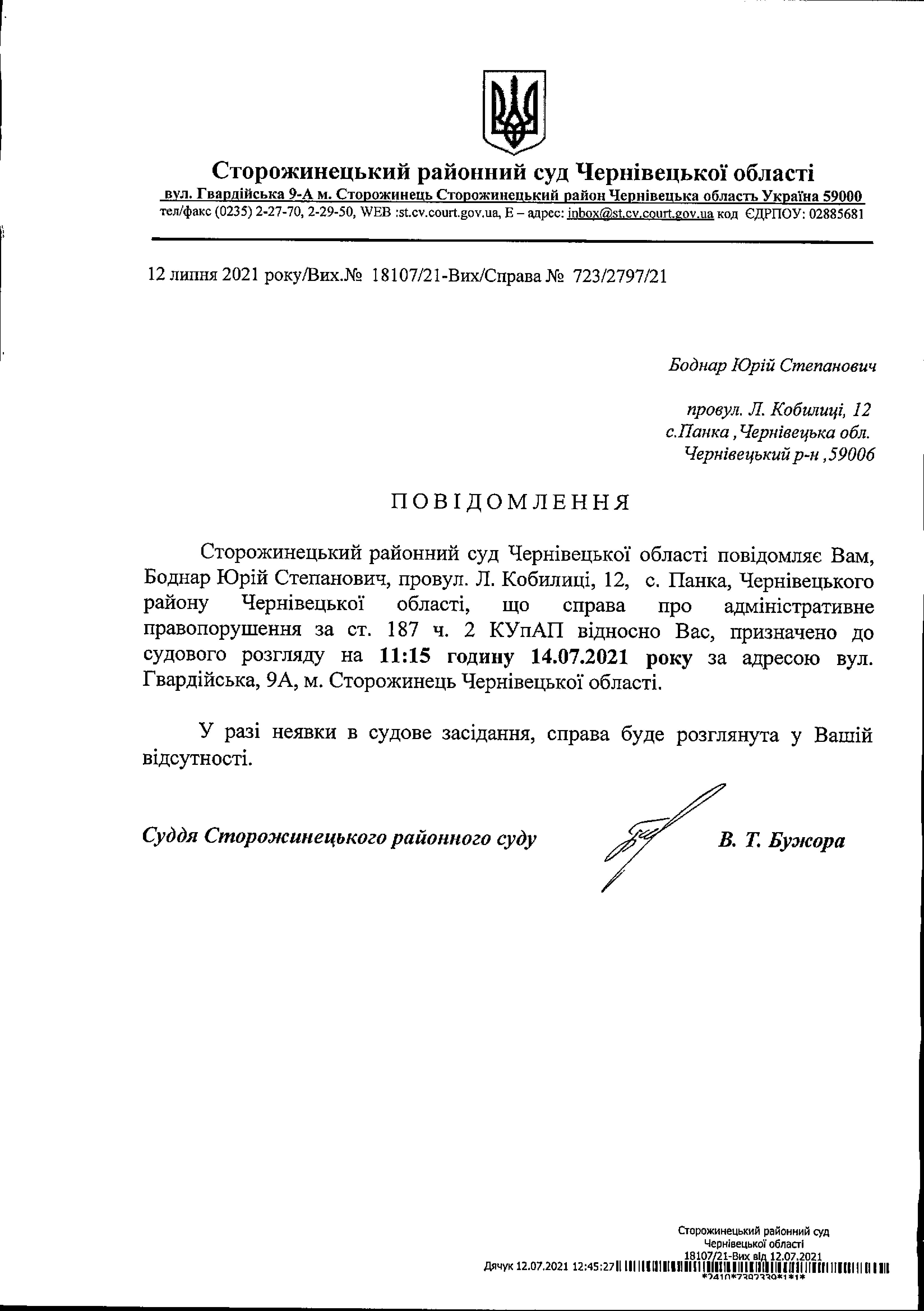 Оголошення про виклик до суду Боднар Юрій Степанович