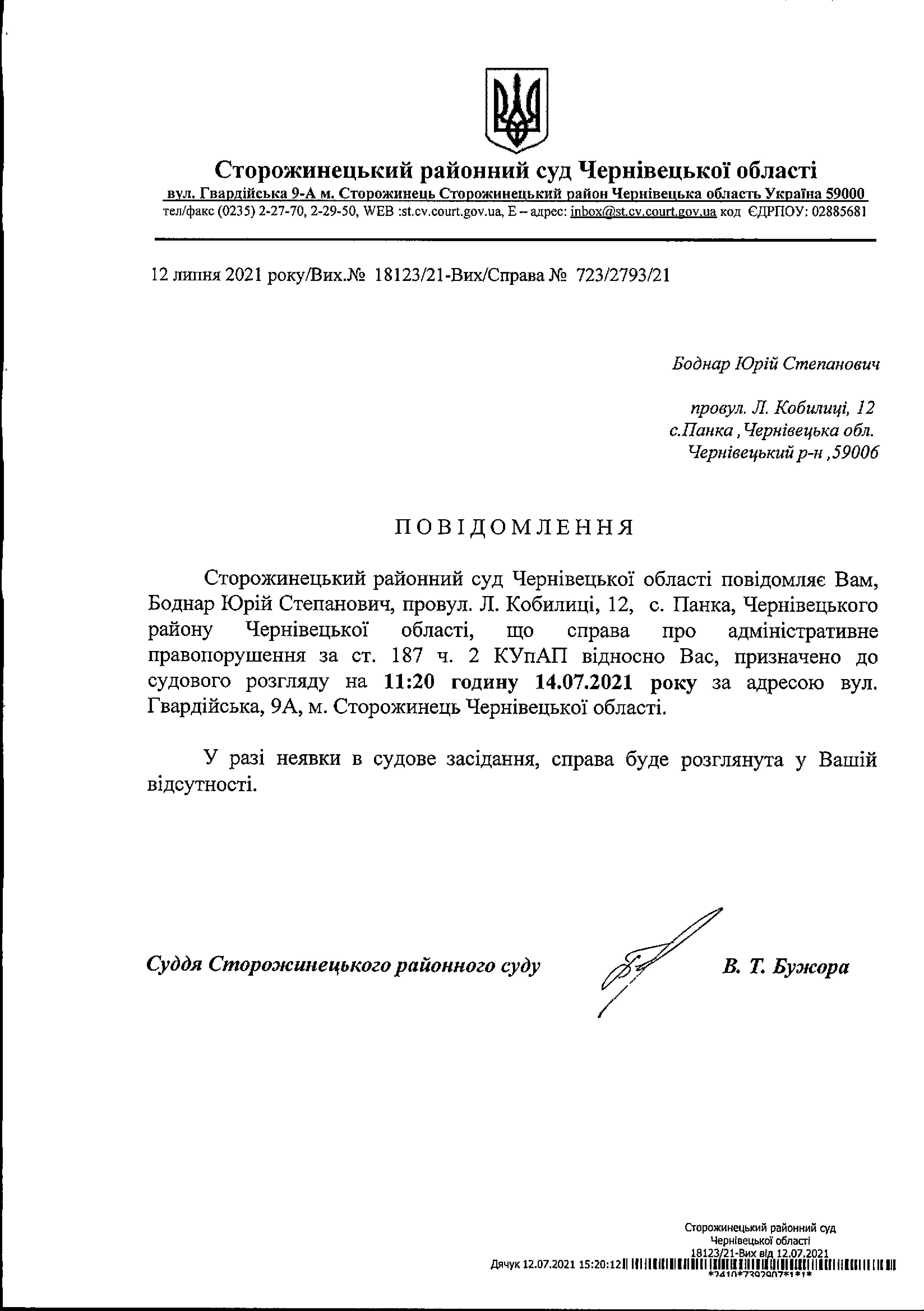 Оголошення про виклик до суду Боднар Юрій Степанович