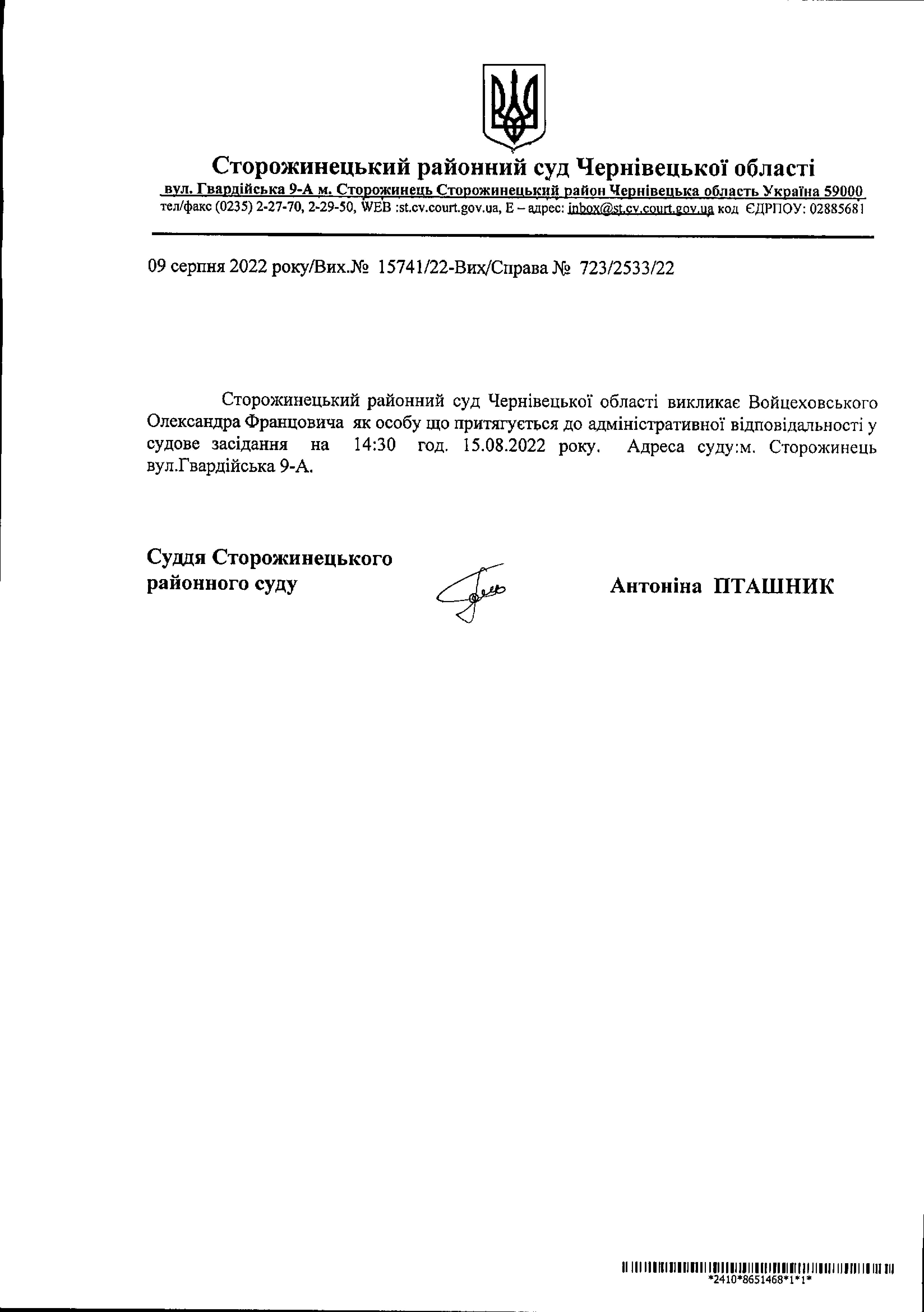 Оголошення про виклик до суду Войцеховського Олександра Францовича