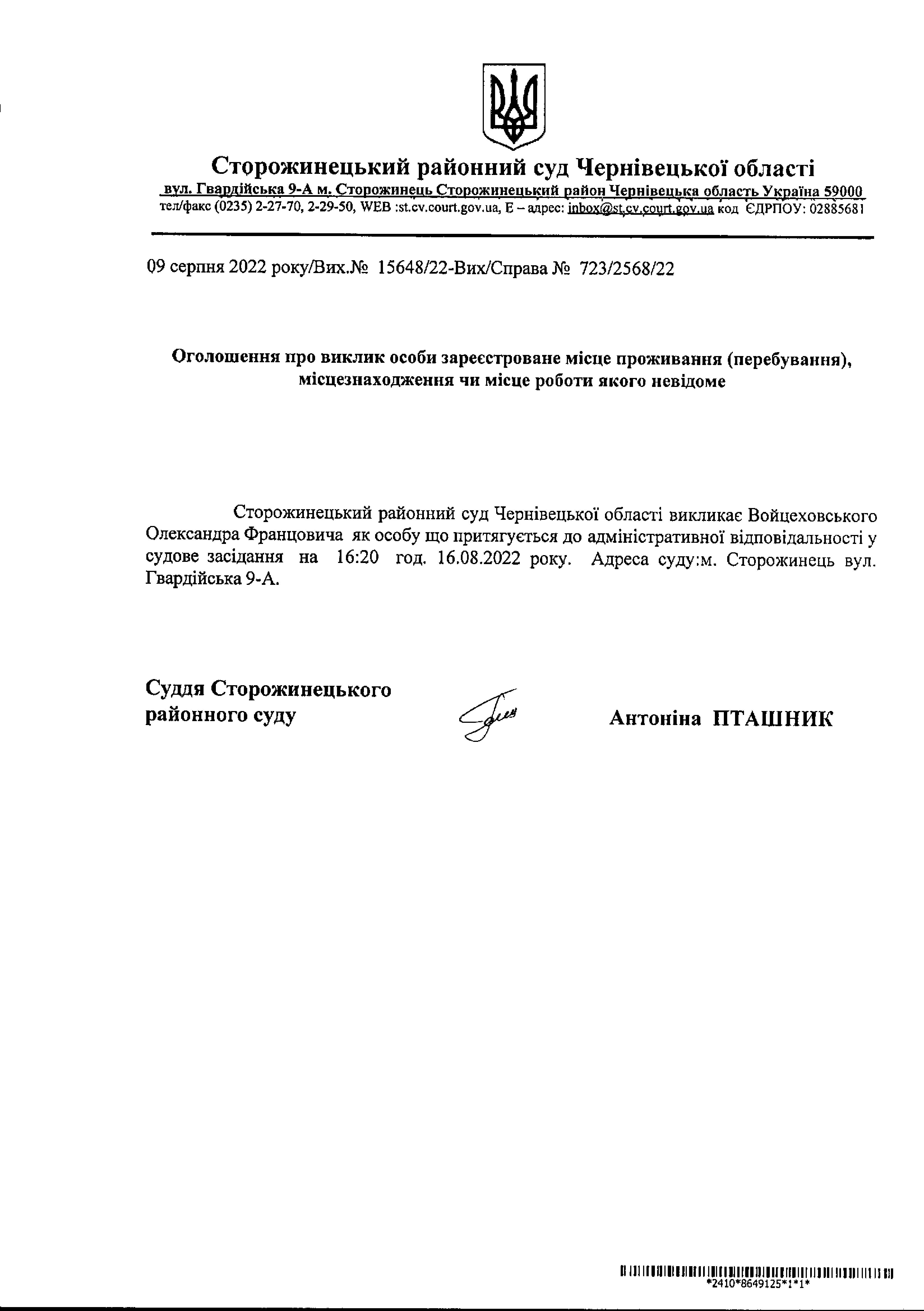 Оголошення про виклик до суду Войцеховського Олександра Францовича