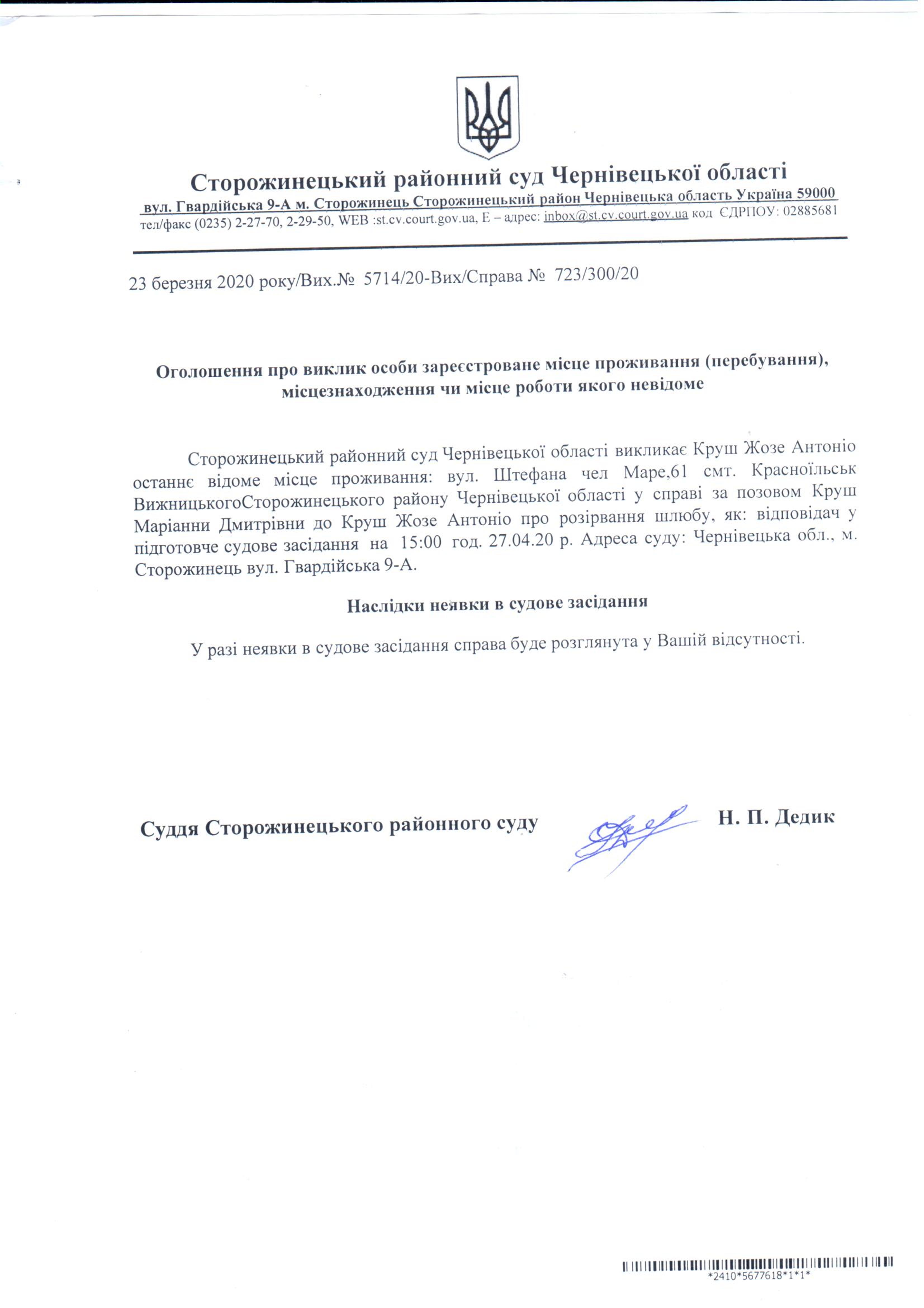 Оголошення про виклик до суду Круш Жозе Антоніо