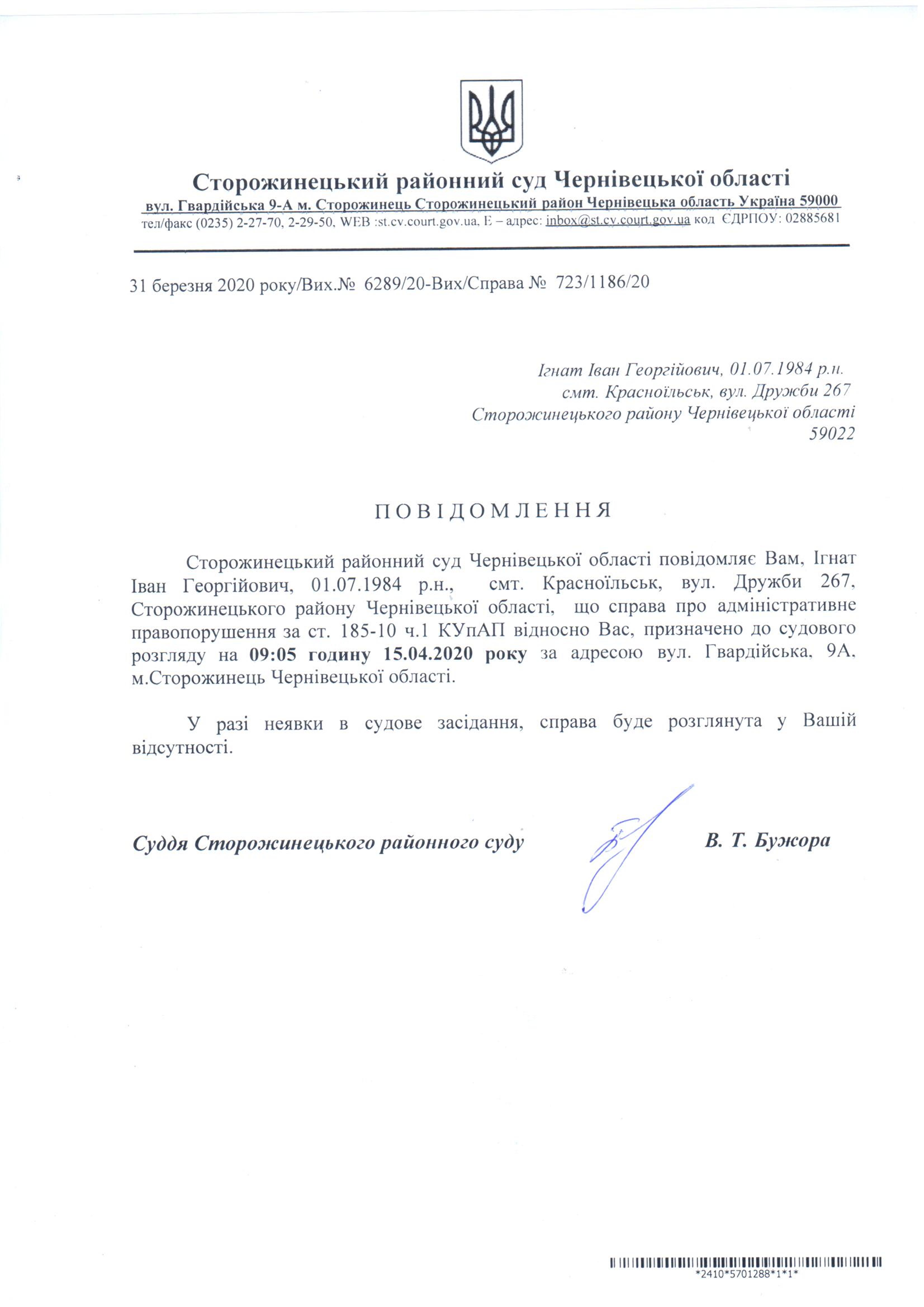 Оголошення про виклик до суду Ігнат Іван Георгійович