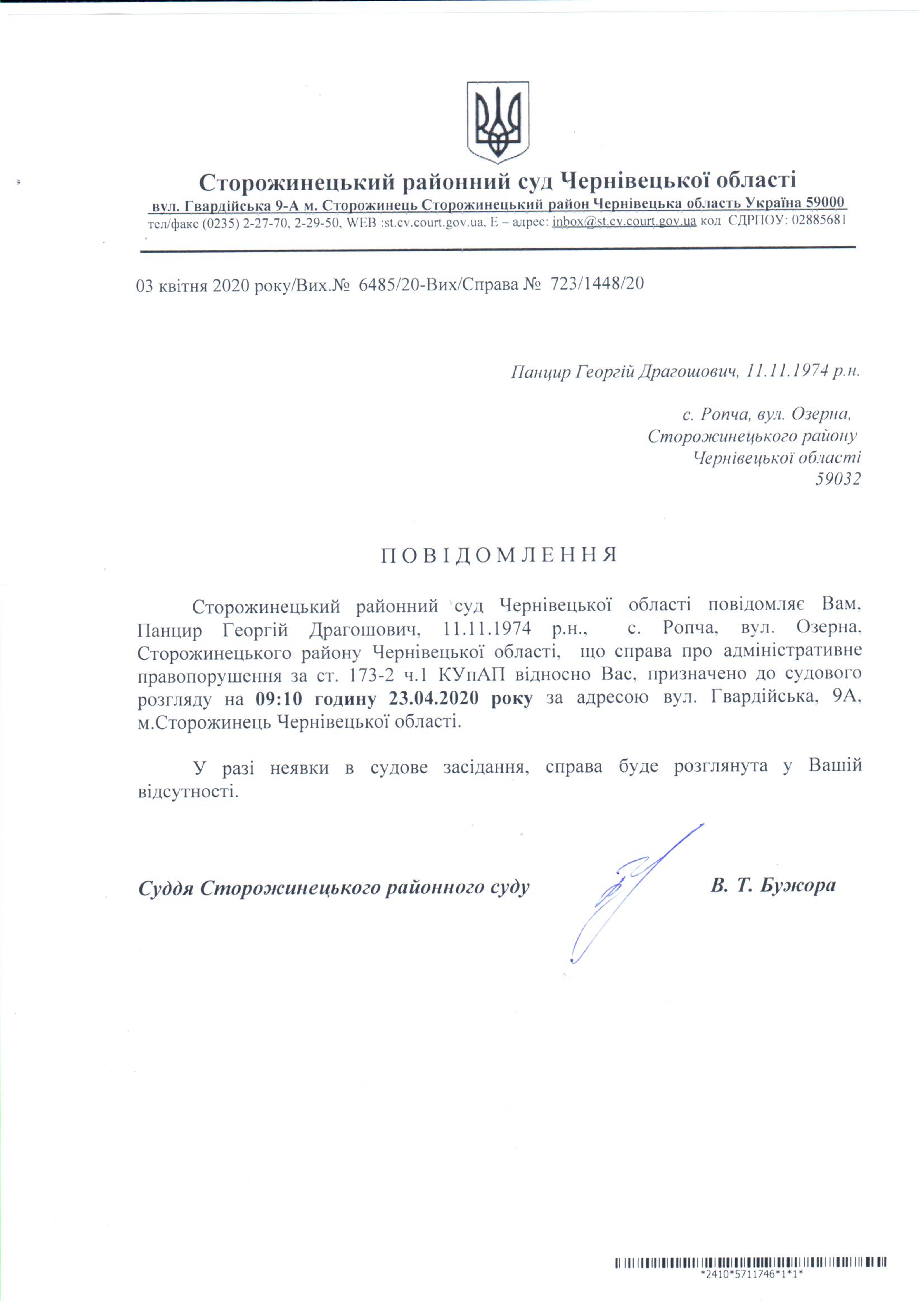 Оголошення про виклик до суду Панцир Георгій Драгошович