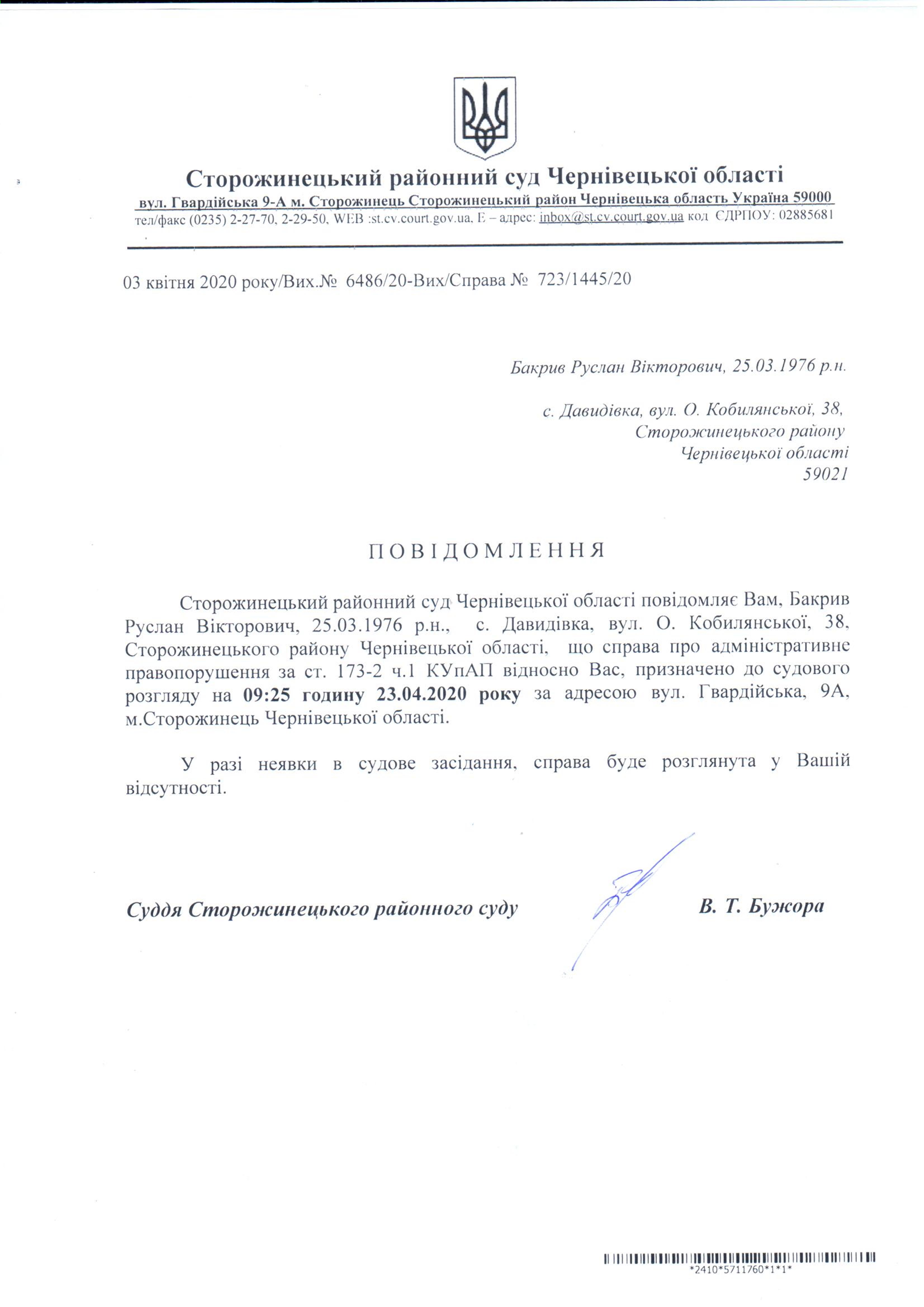 Оголошення про виклик до суду Бакрив Руслан Вікторович