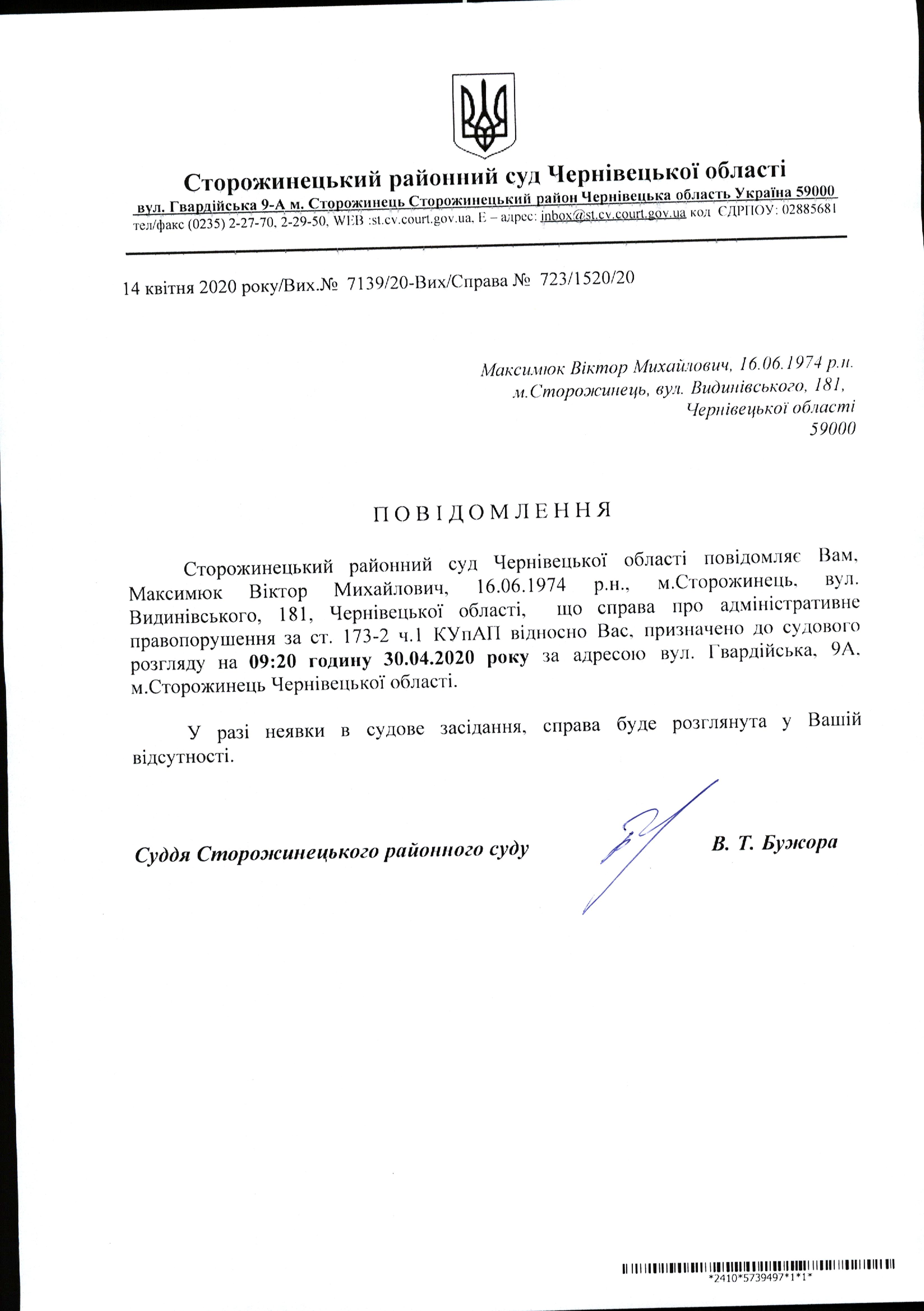 Оголошення про виклик до суду Максимюк Віктор Михайлович