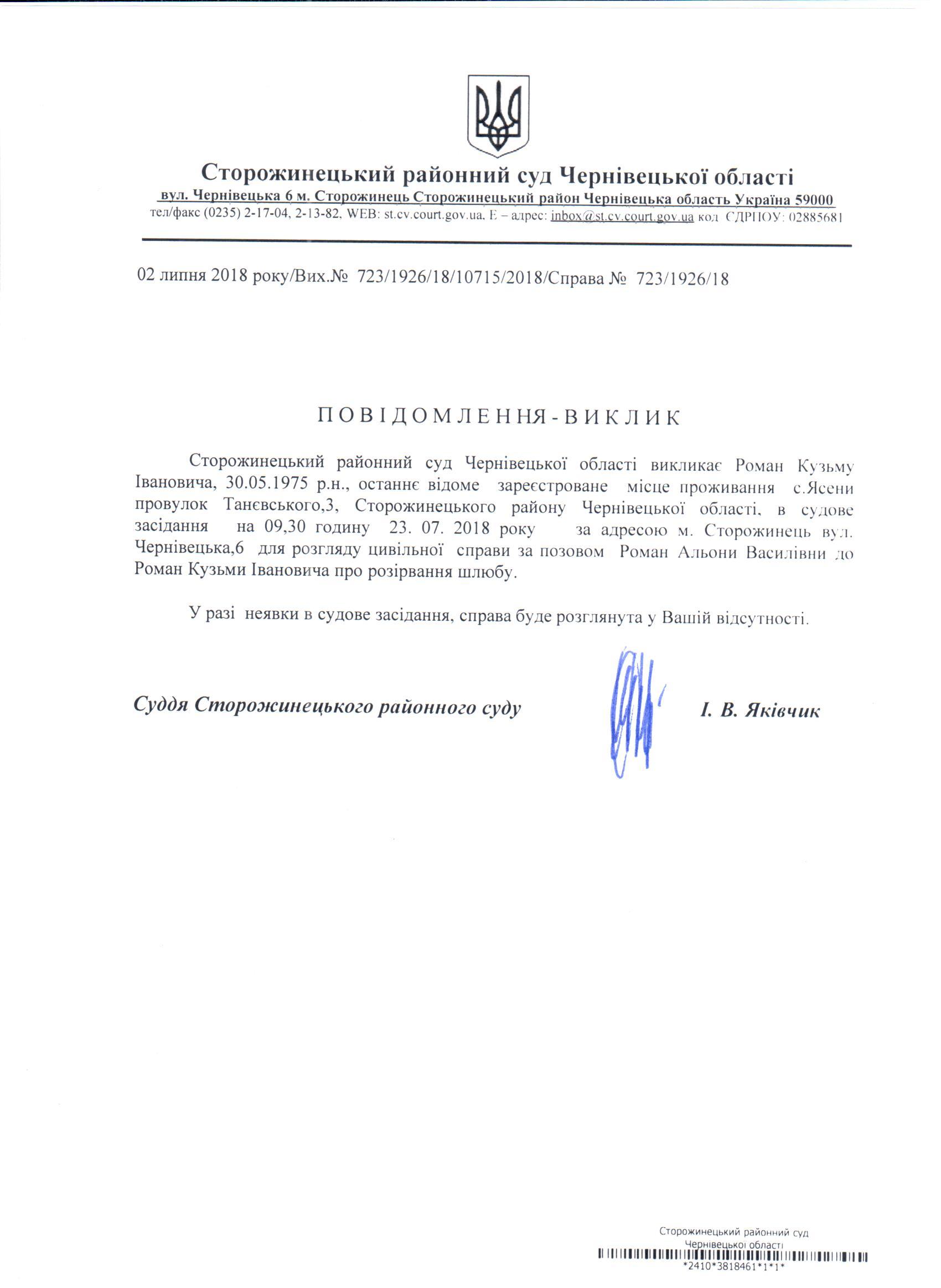Повідомлення про виклик до суду Роман Кузьму Івановича
