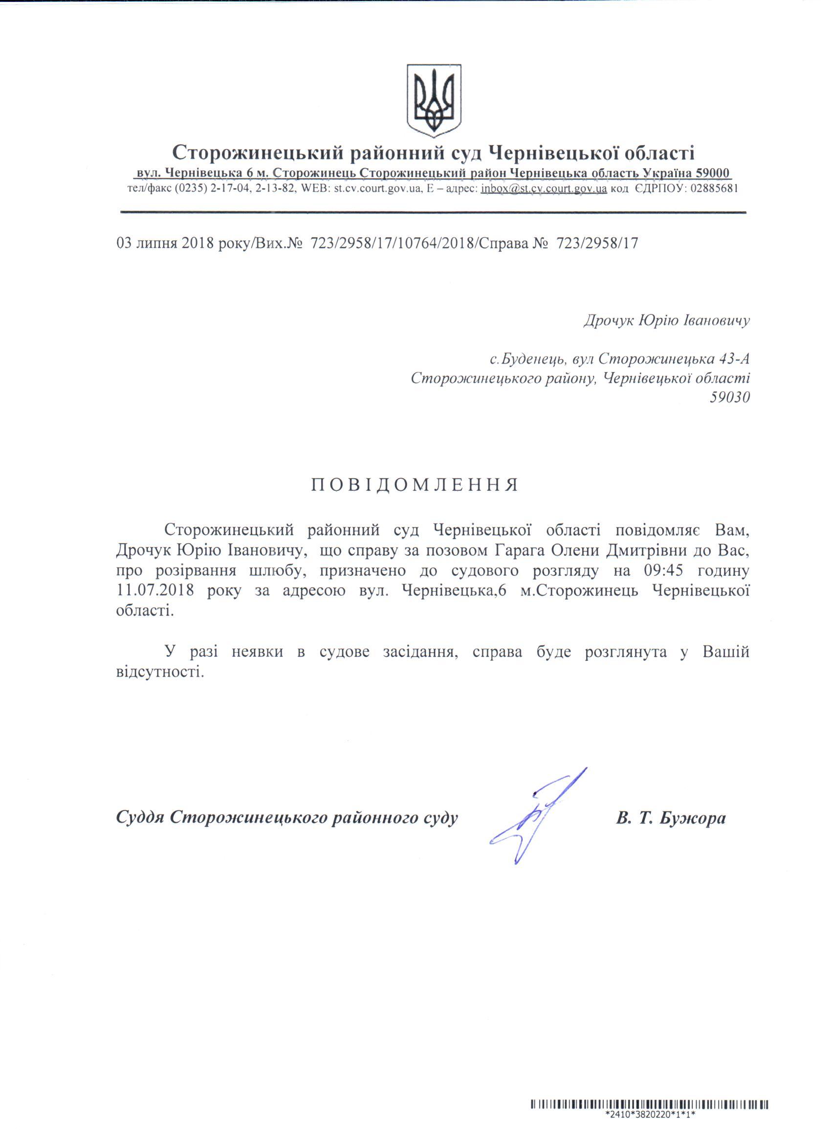 Повідомлення про виклик до суду Дрочук Юрію Івановичу