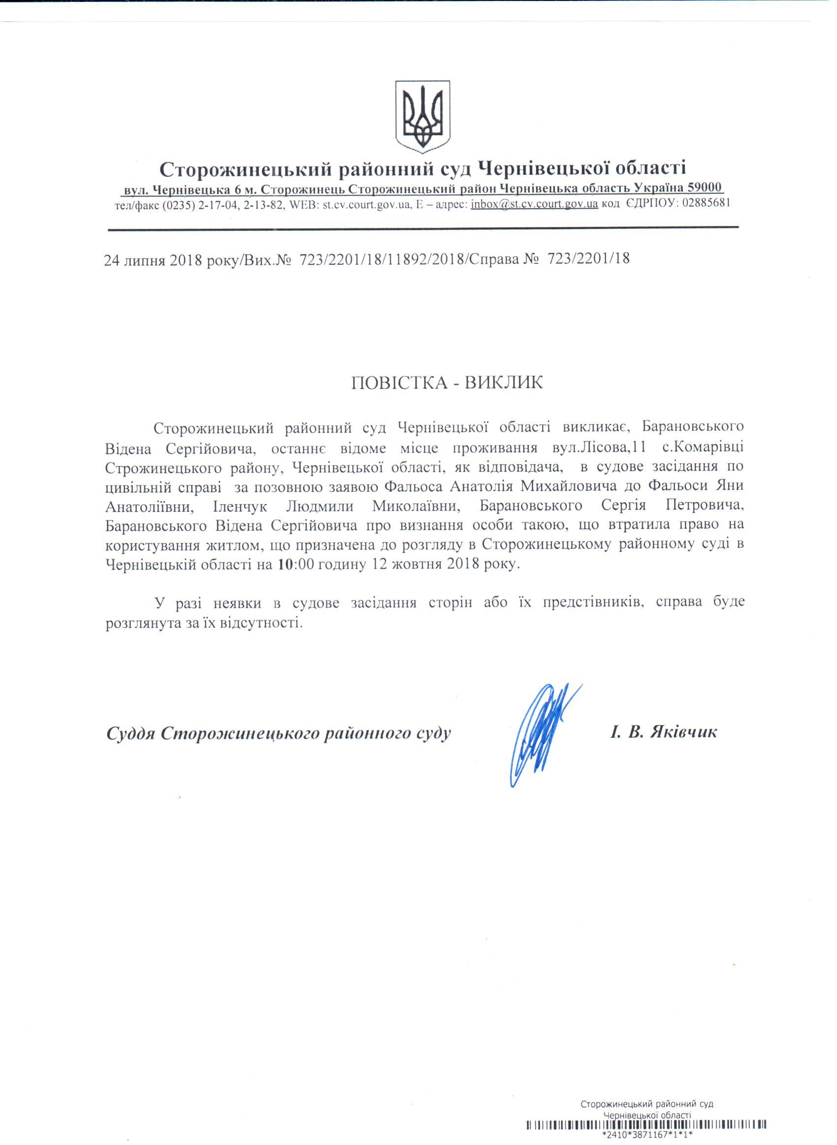 Повістка про виклик до суду Барановського Відена Сергійовича