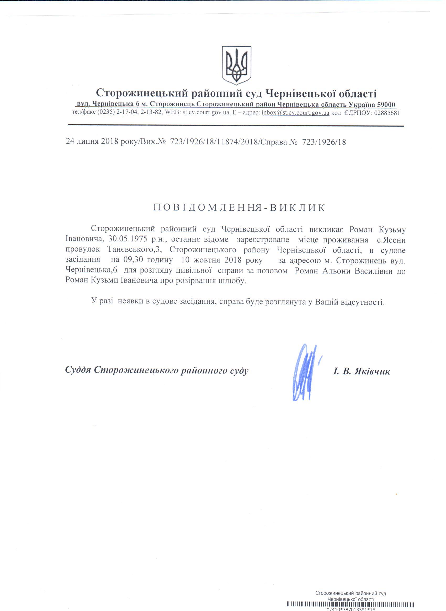 Повідомлення про виклик до суду Романа Кузьму Івановича