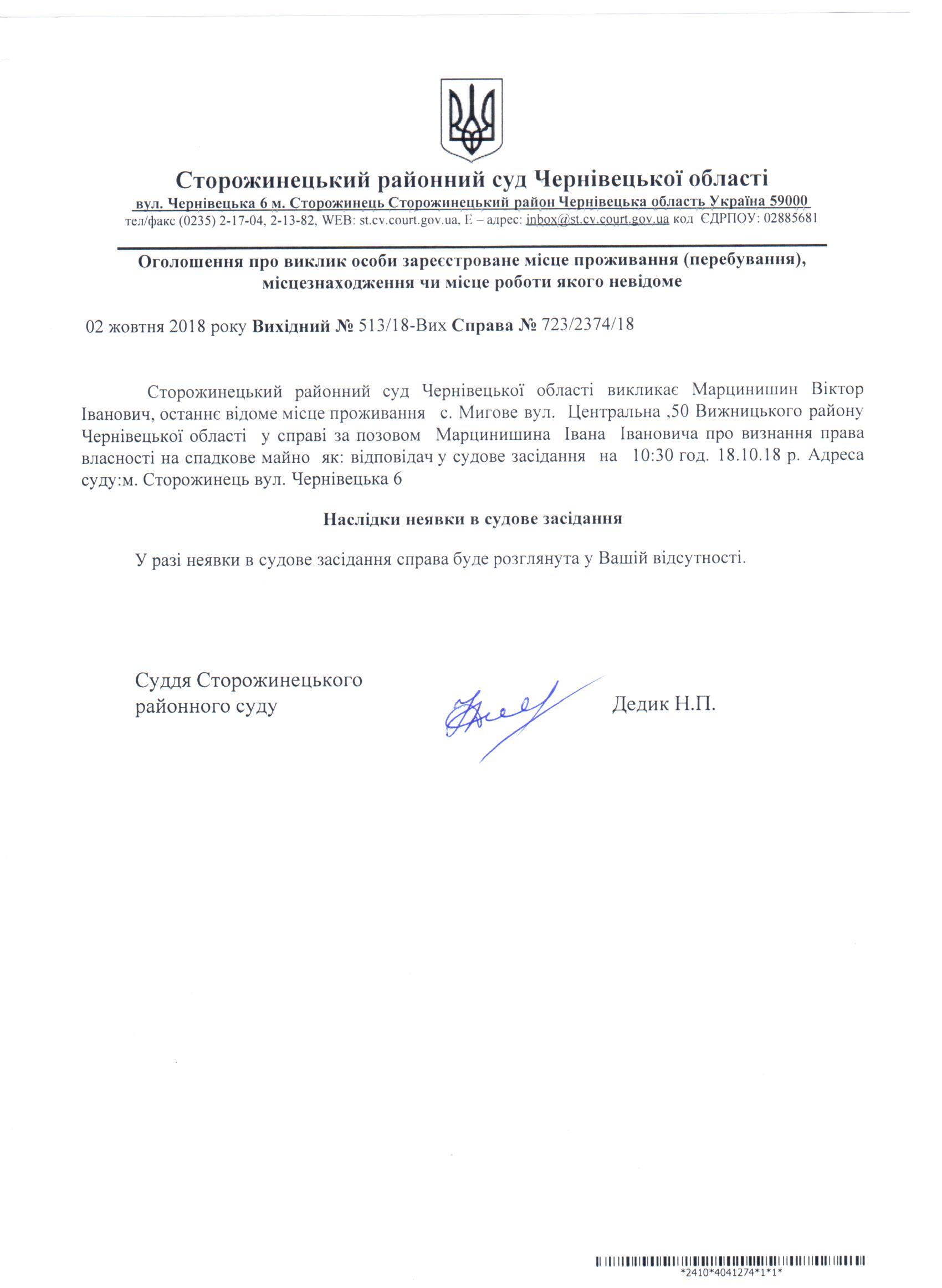 Оголошення про виклик до суду Марцинишин Віктор Іванович