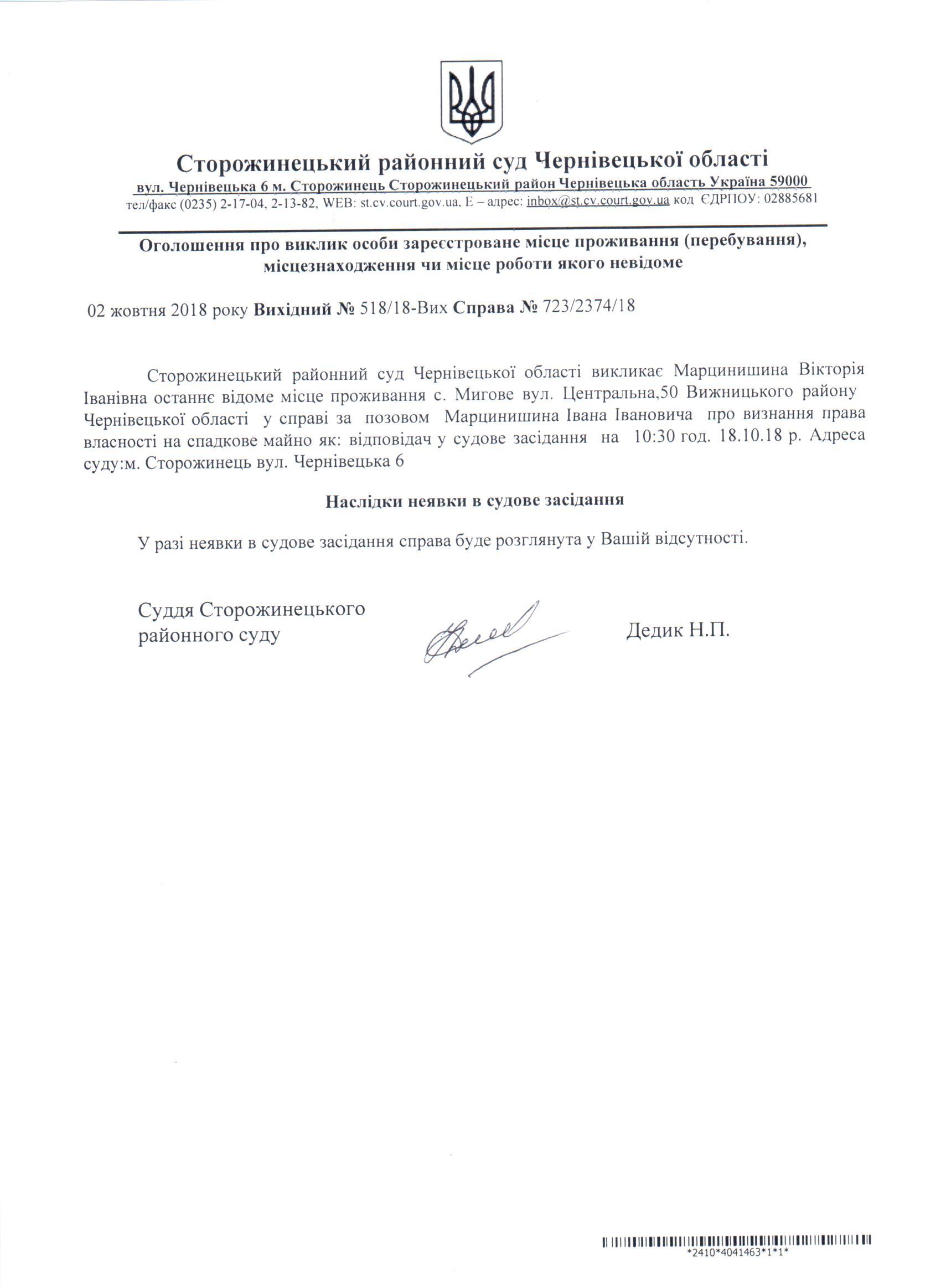 Оголошення про виклик до суду Марцинишина Вікторія Іванівна
