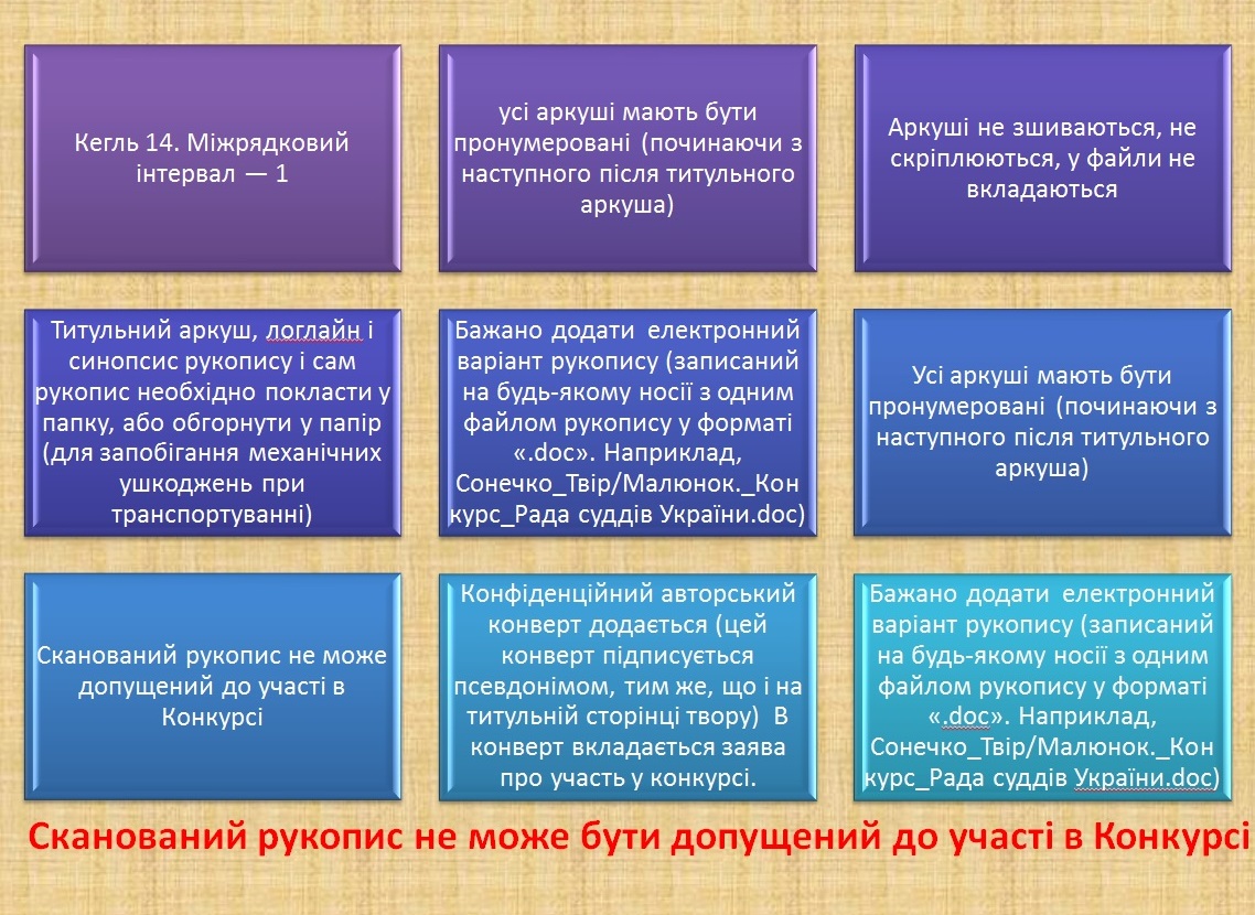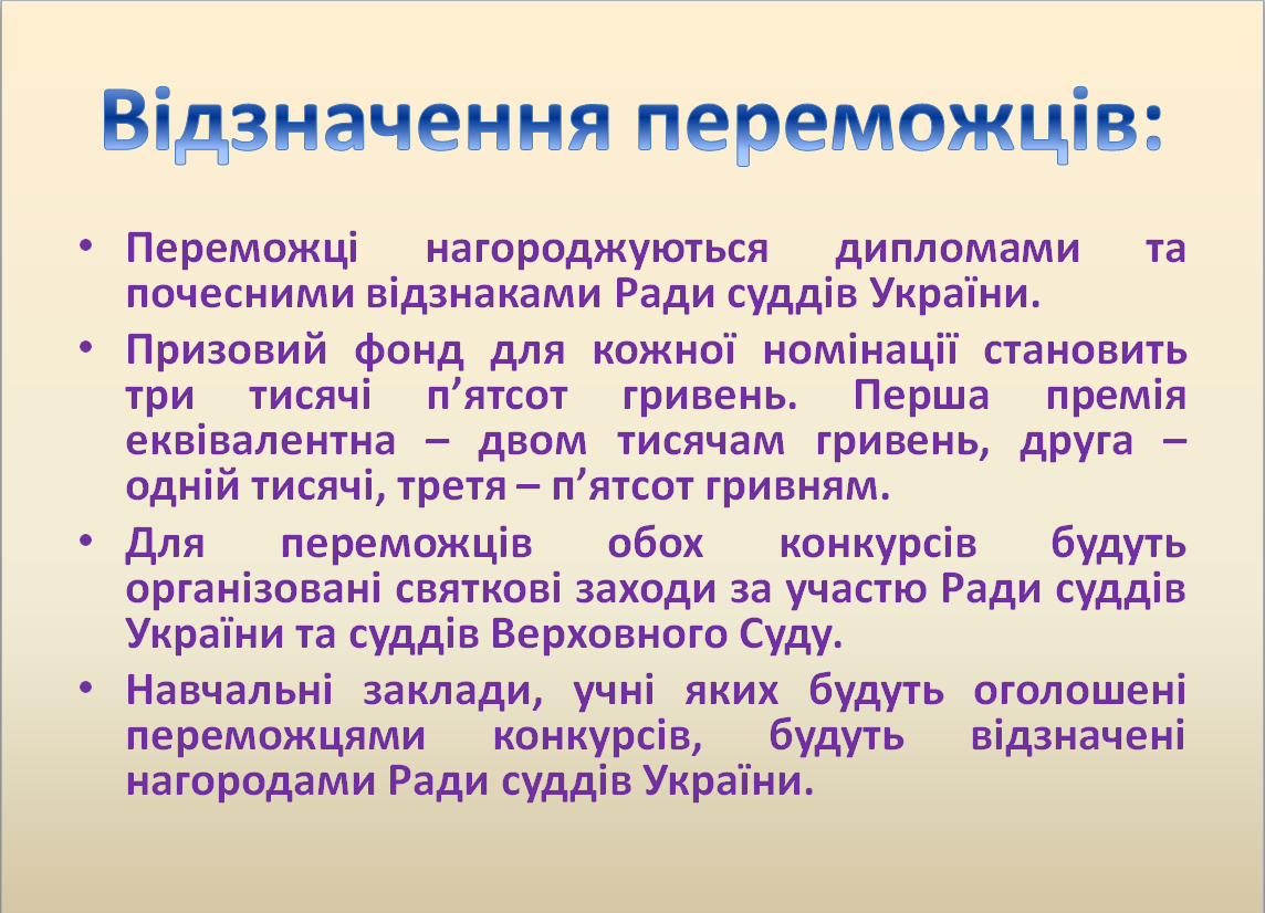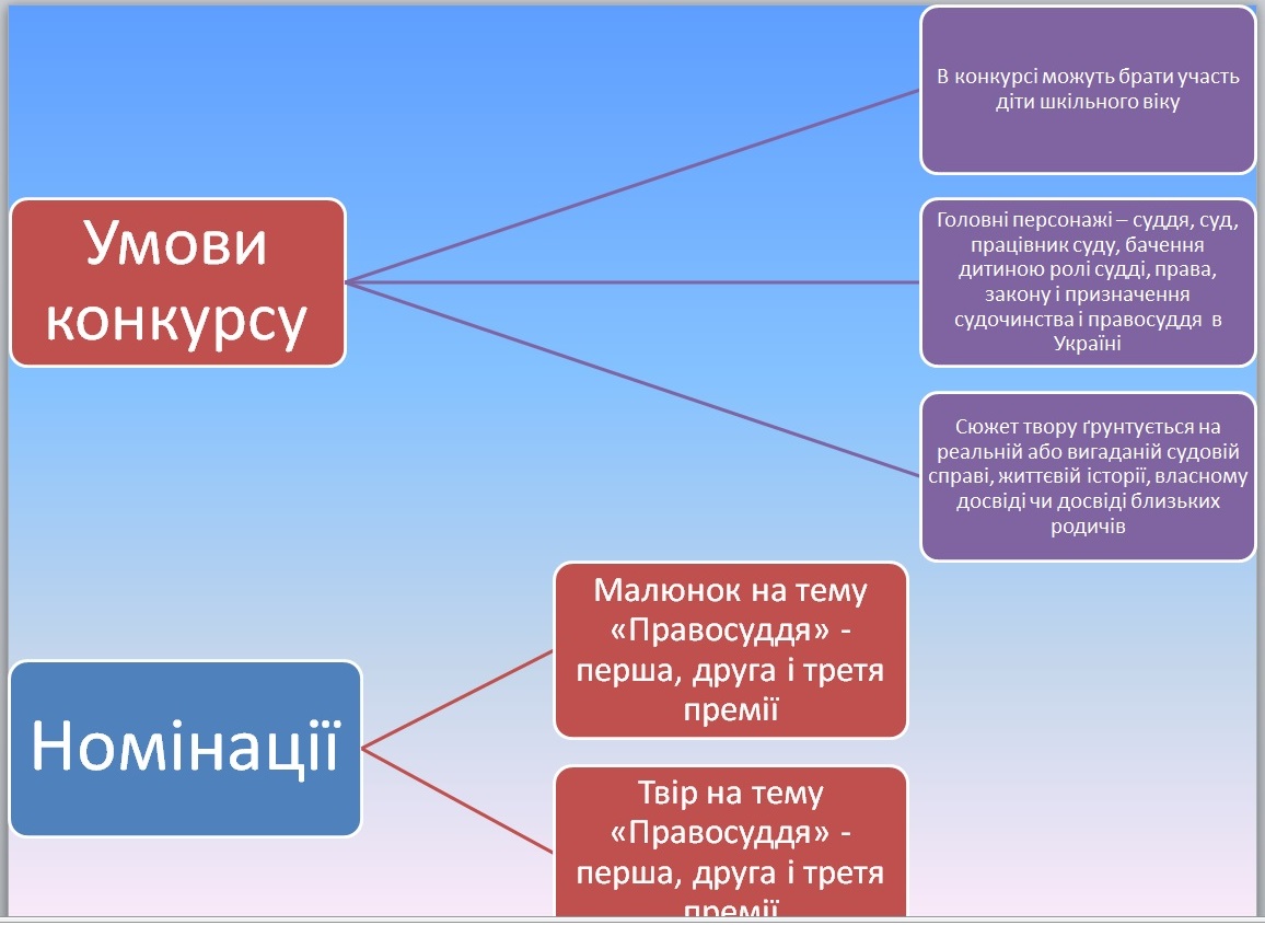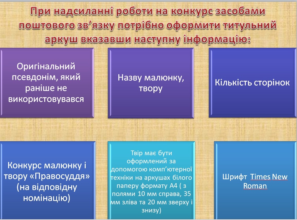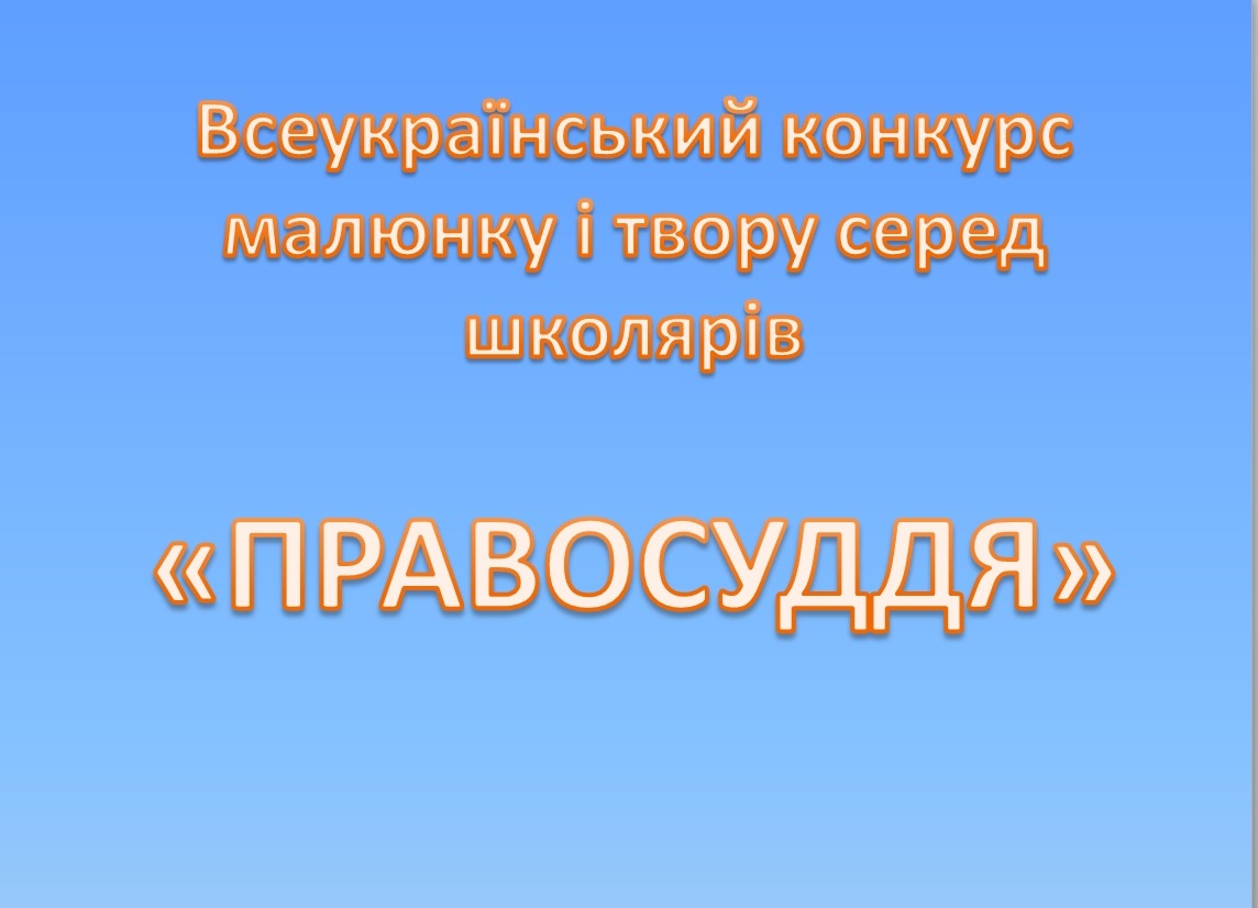 Вимоги до малюнків: головні персонажі – суддя, суд, працівник суду, бачення дитиною ролі судді, права, закону і призначення судочинства і правосуддя в Україні.