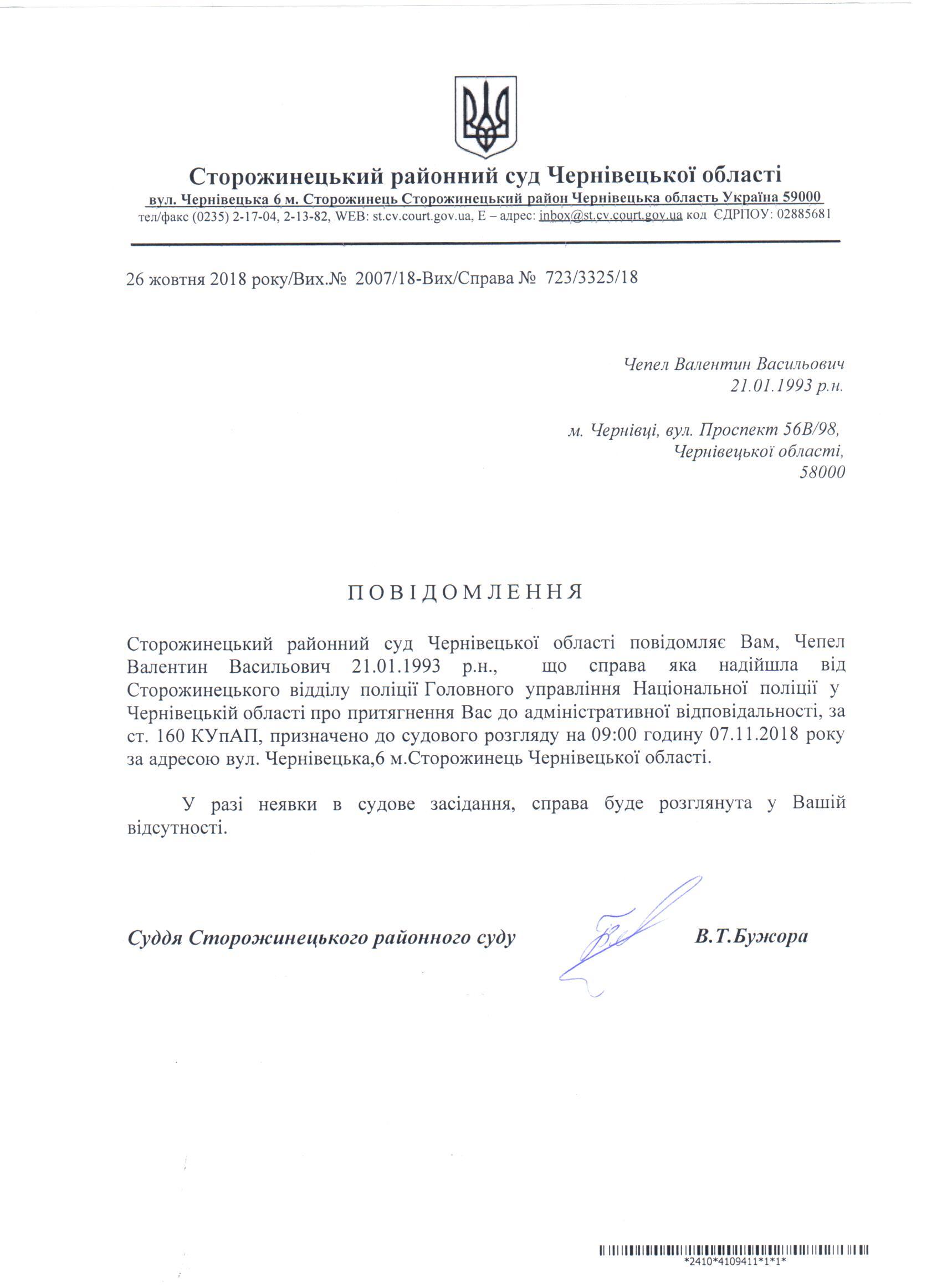 Оголошення про виклик до суду Чепел Валентин Васильович
