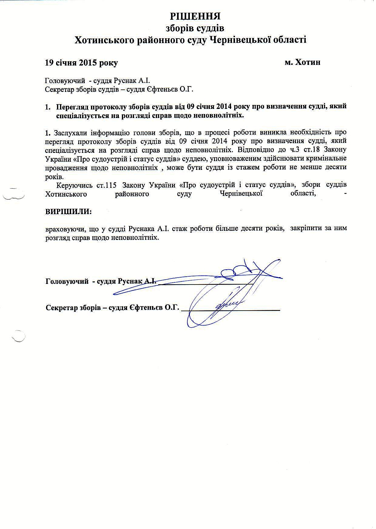 Рішення зборів суддів від 19.01.2015 року (Перегляд протоколу зборів суддів від 09 січня 2014 року про визначення судді, який спеціалізується на розгляді справ щодо неповнолітніх)