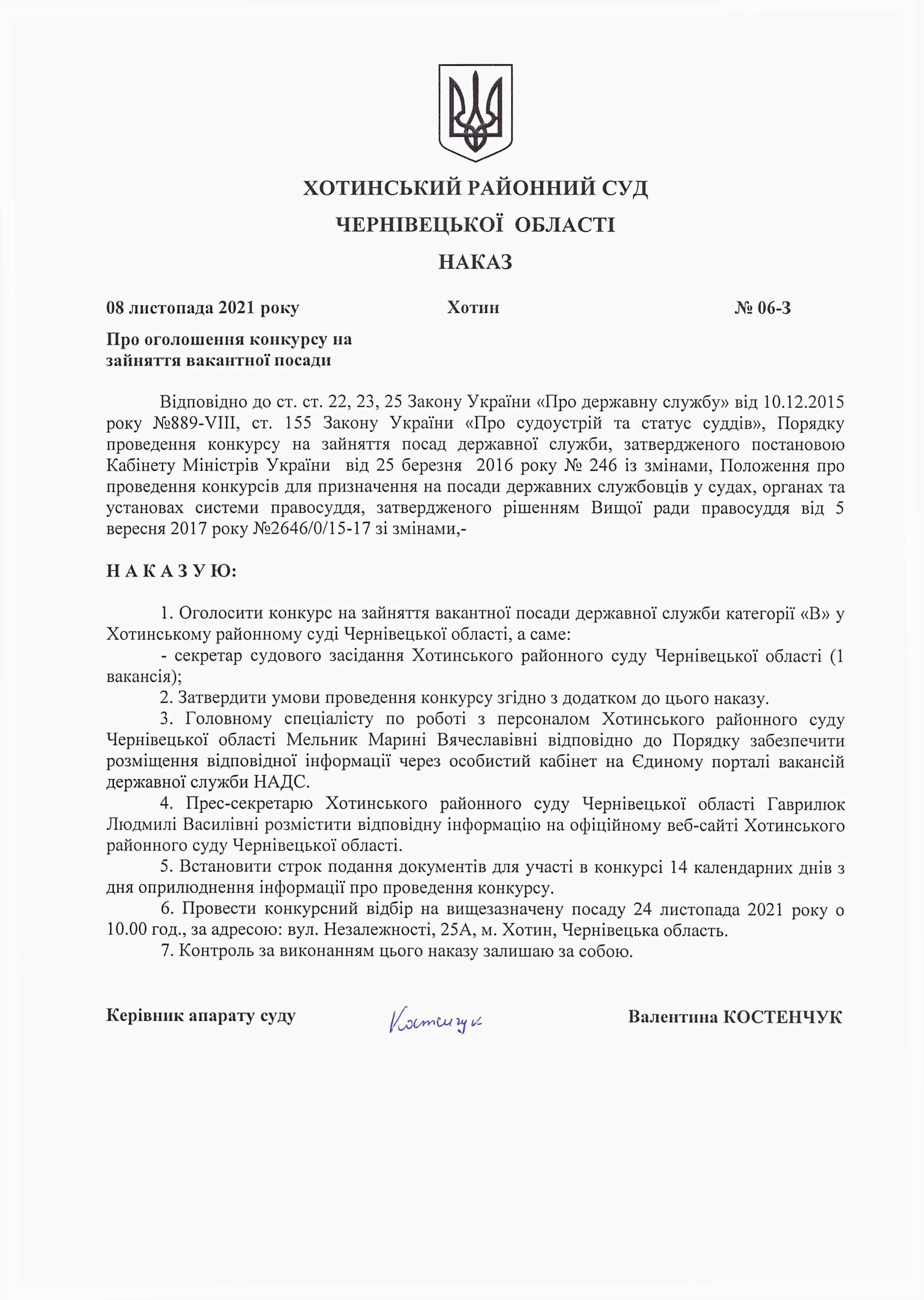 Наказ керівника апарату Хотинського районного суду Чернівецькій області