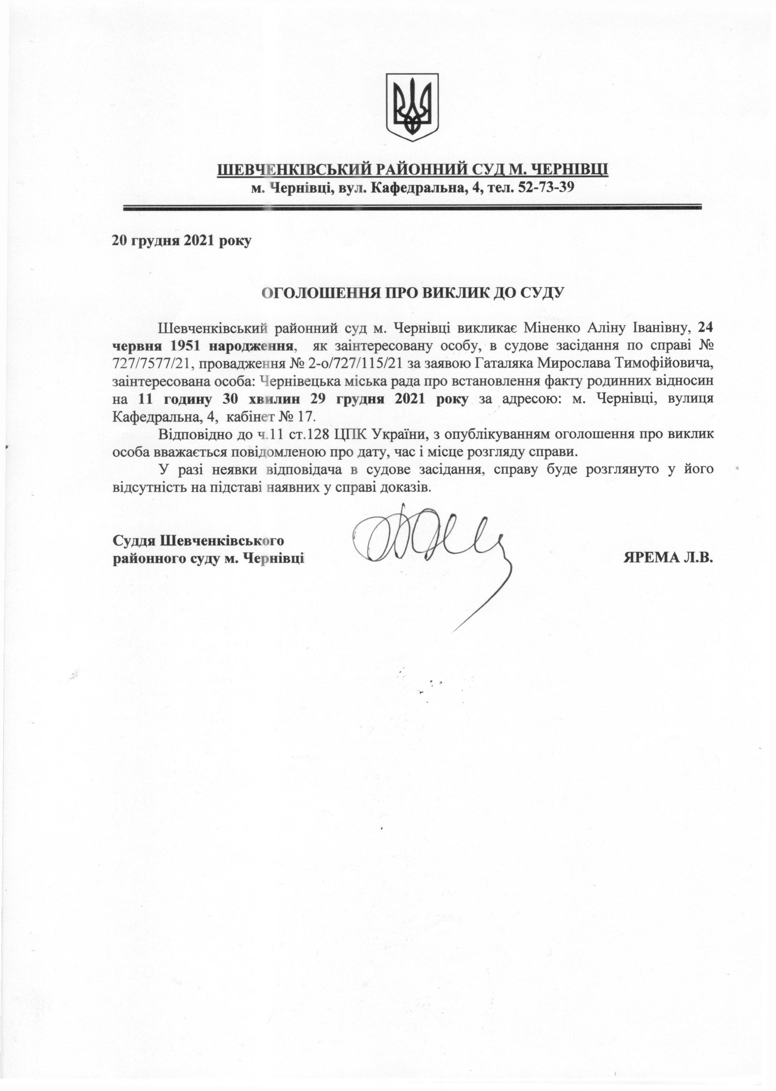 Оголошення про виклик до суду Міненко Аліну Іванівну