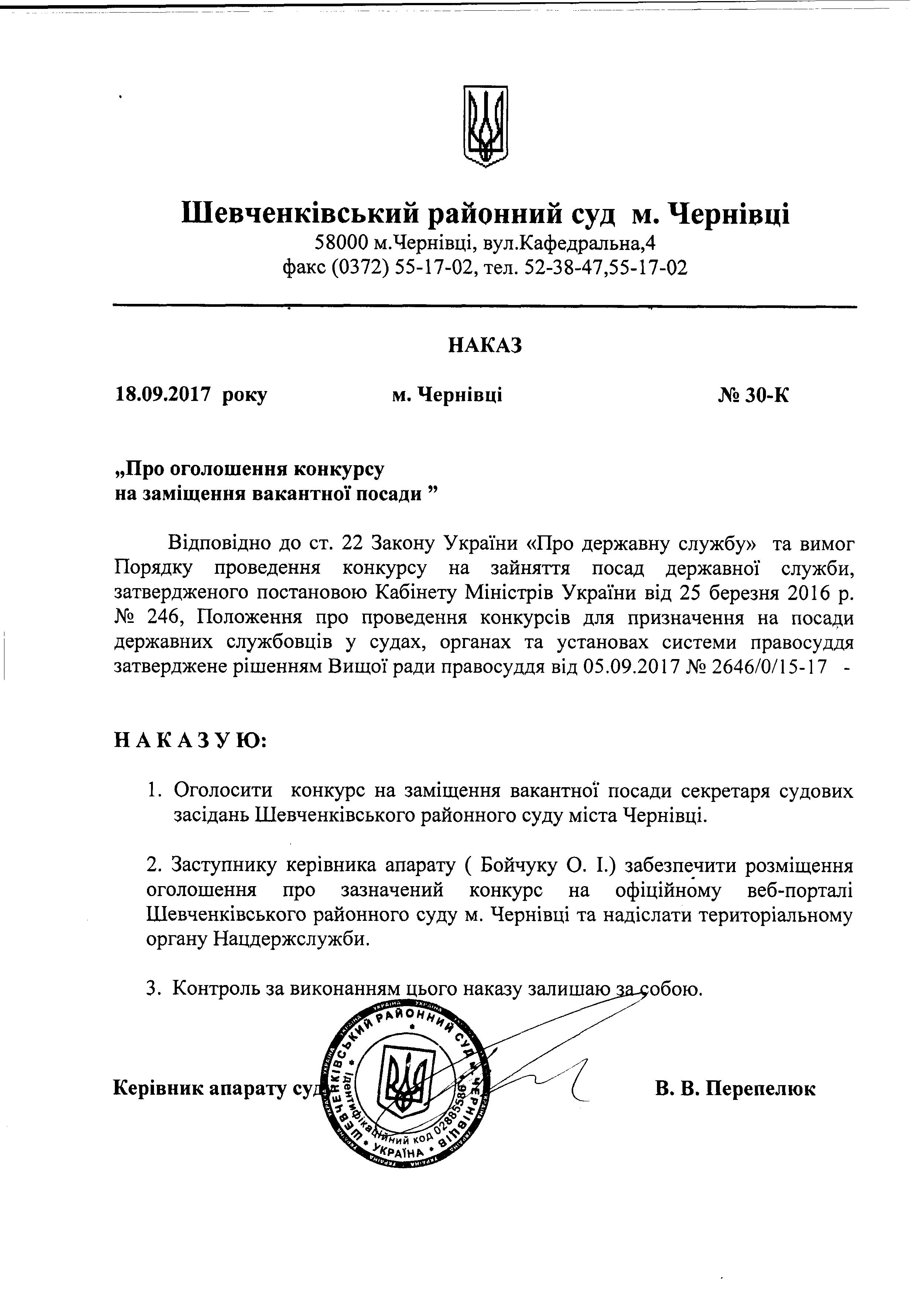 до наказу Шевченківського районного суду м. Чернівці