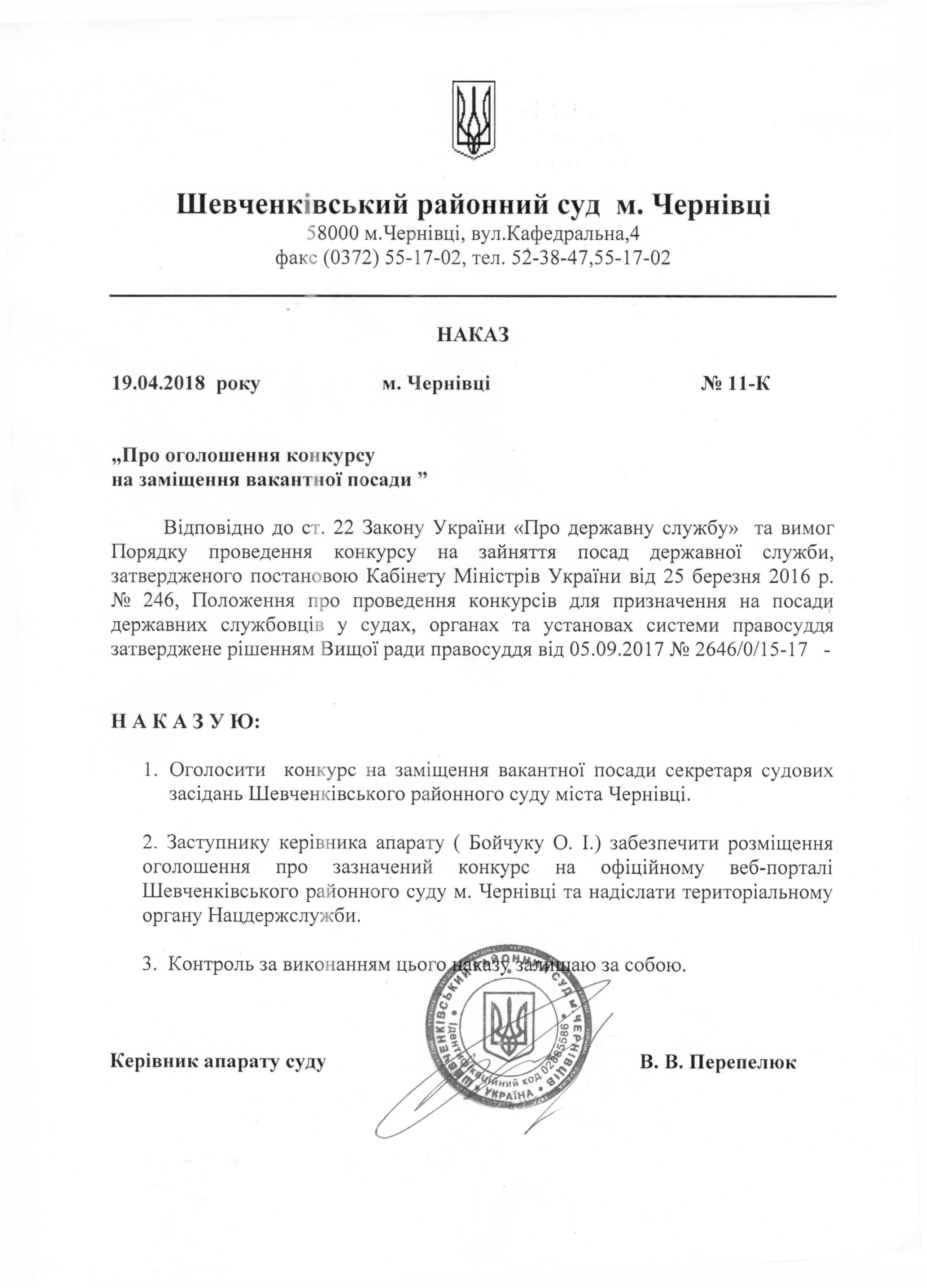 Наказ Шевченківського районного суду м. Чернівці № 11-к від 19.04.18.