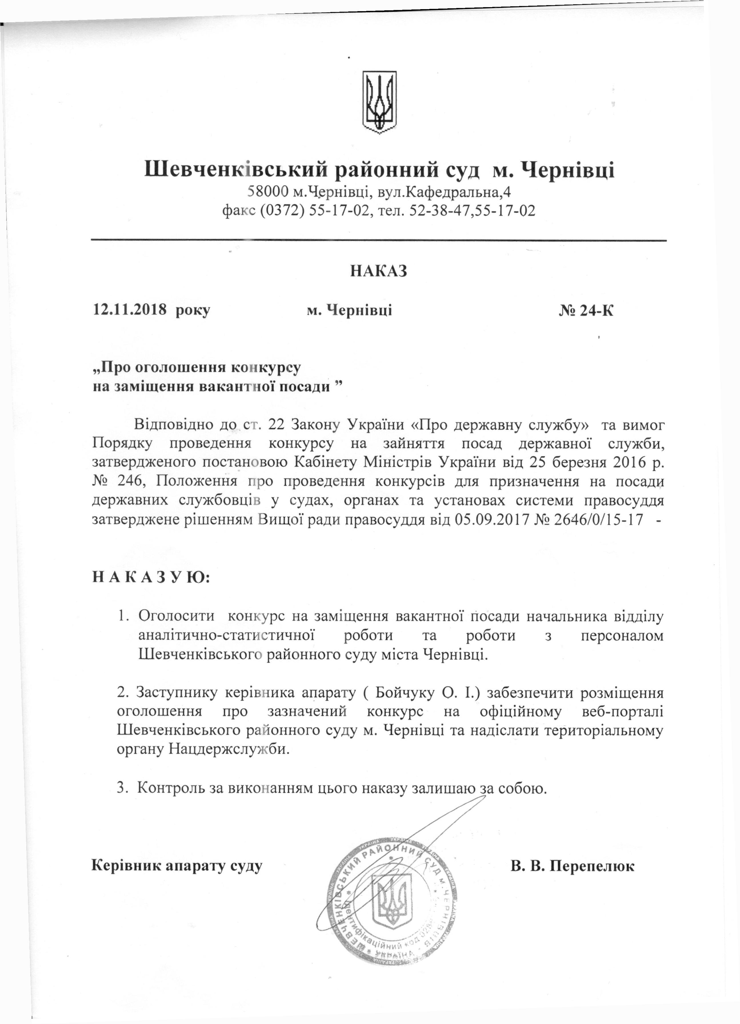 проведення конкурсу на зайняття вакантної посади начальника відділу аналітично-статистичної роботи та роботи з персоналом