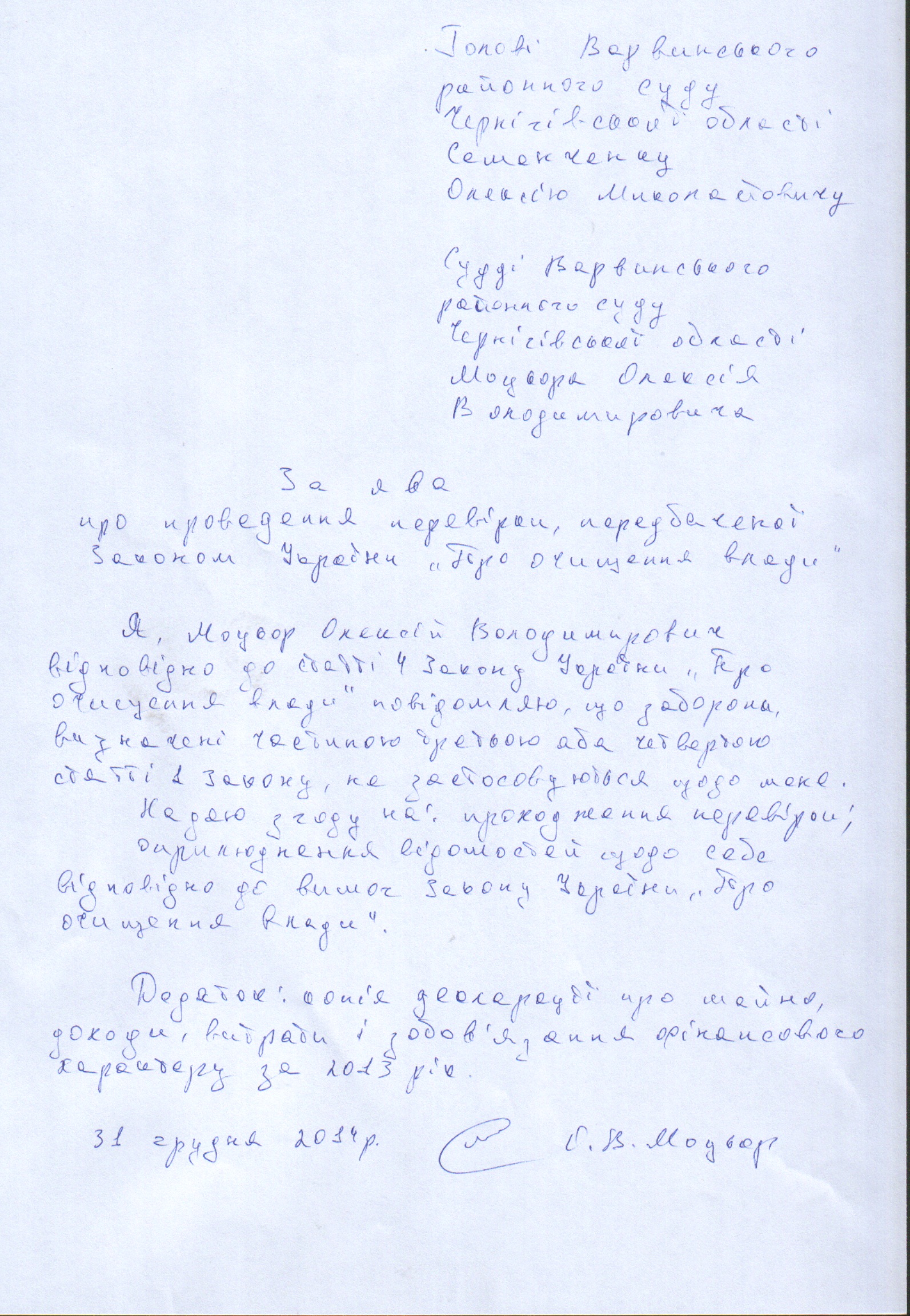 Повідомлення про початок проведення перевірки щодо судді Варвинського районного суду Моцьора О.В.