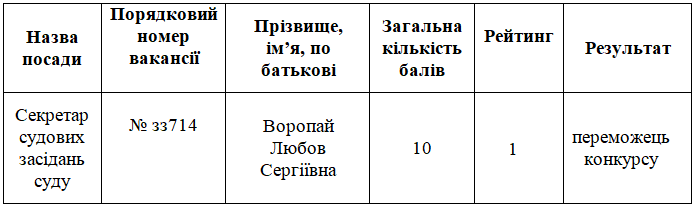 Відповідно до пунктів 591, 60 Порядку проведення конкурсу на зайняття посад державної служби, затвердженого постановою Кабінету Міністрів України від 25 березня 2016 року № 246, із змінами і доповненнями (далі – Порядок), Деснянський районний суд м. Чернігова інформує про результати конкурсу на зайняття посади державної служби категорії «В» – секретаря судових засідань Деснянського районного суду м. Чернігова, оголошеного та проведеного відповідно до наказу керівника апарату суду від 05 грудня 2019 року № 90-д/к «Про оголошення конкурсу на зайняття посади державної служби».