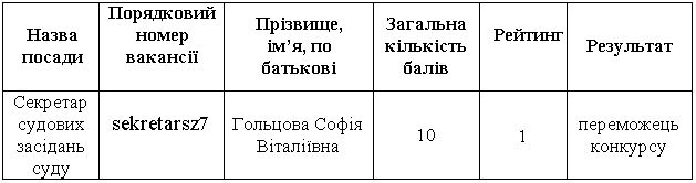 Відповідно до пунктів 591, 60 Порядку проведення конкурсу на зайняття посад державної служби, затвердженого постановою Кабінету Міністрів України від 25 березня 2016 року № 246, із змінами і доповненнями (далі – Порядок), Деснянський районний суд м. Чернігова інформує про результати конкурсу на зайняття посади державної служби категорії «В» – секретаря судових засідань Деснянського районного суду
