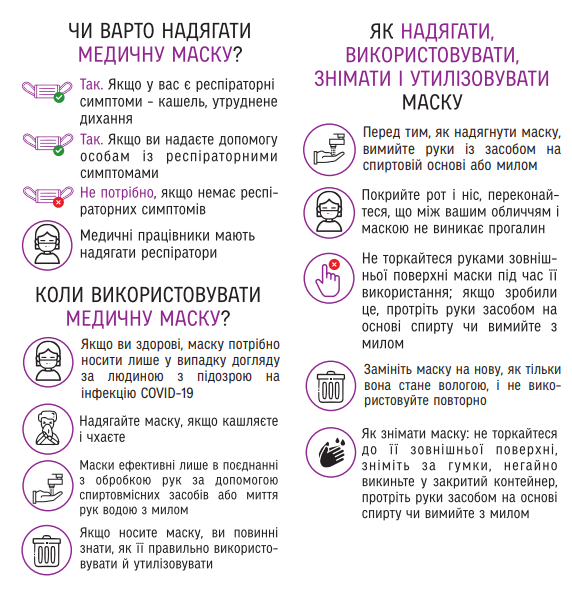 – відмовтеся від одноразових масок після кожного використання та утилізувати їх негайно після зняття. Носити одноразову маску можна не більше двох годин.