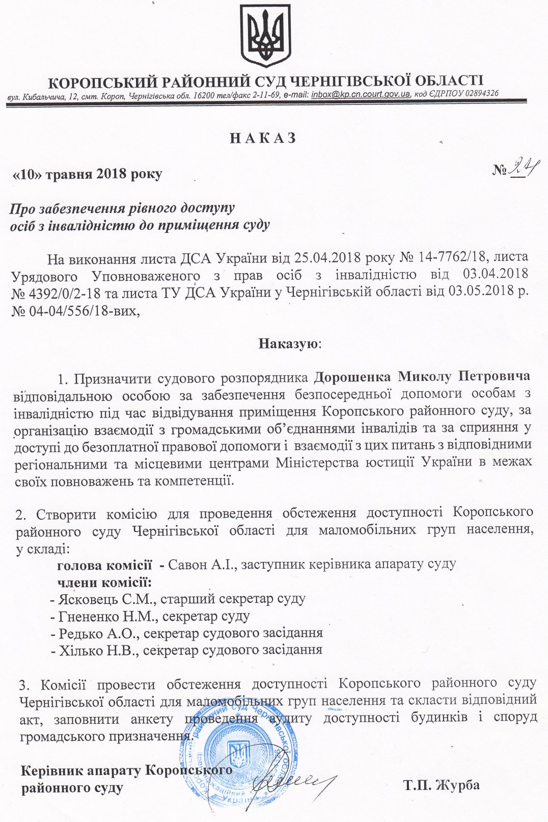 під час відвідування приміщення Коропського районного суду та за організацію взаємодії Коропського