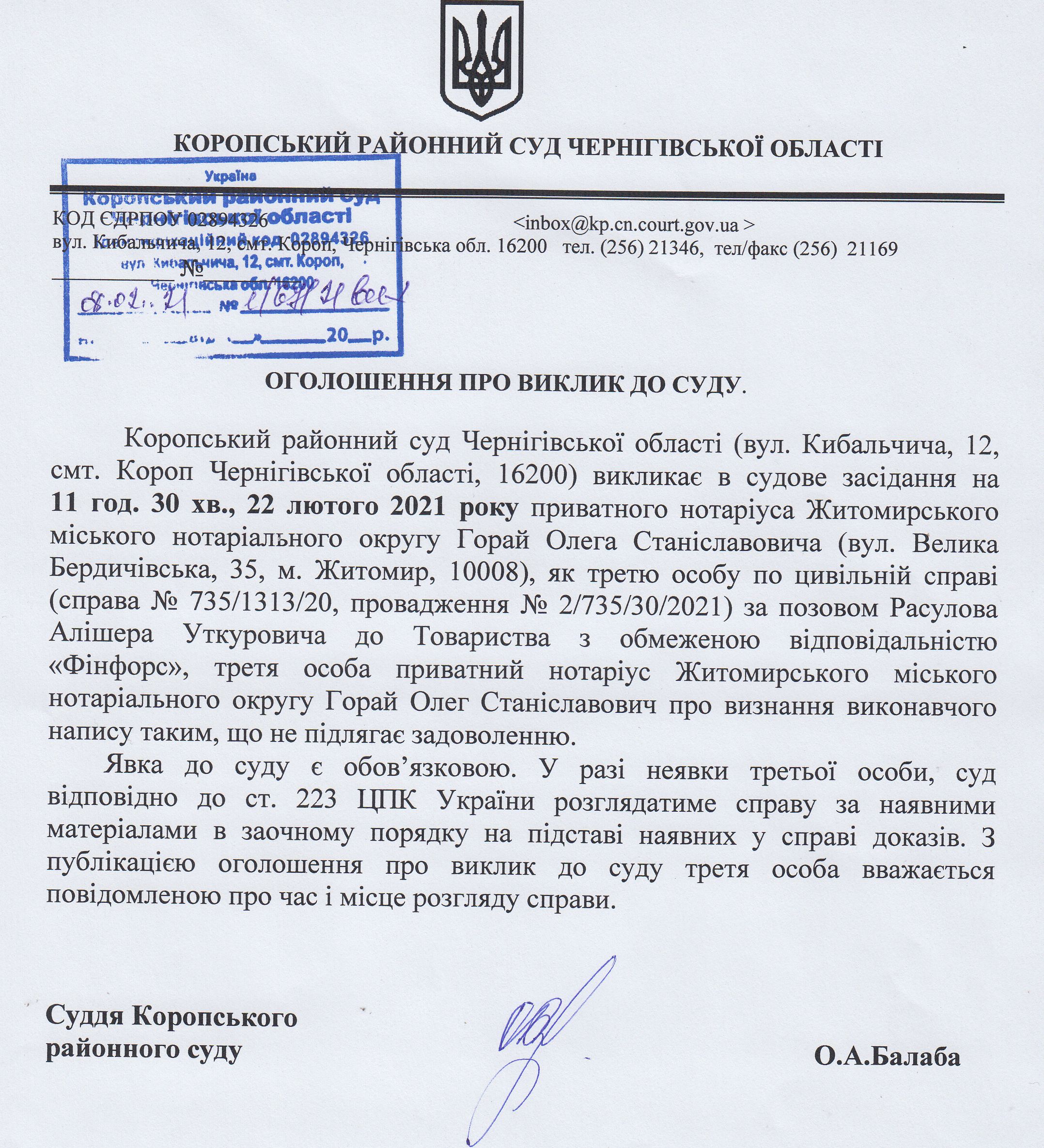 Оголошення про виклик до суду Гарай О.С.