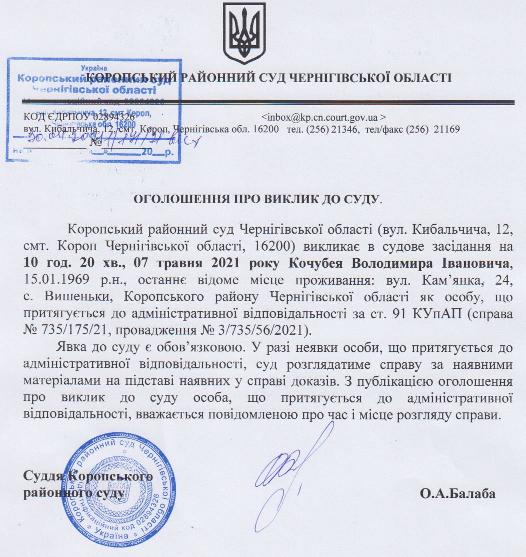 Оголошення про виклик до суду Кочубей В.І.