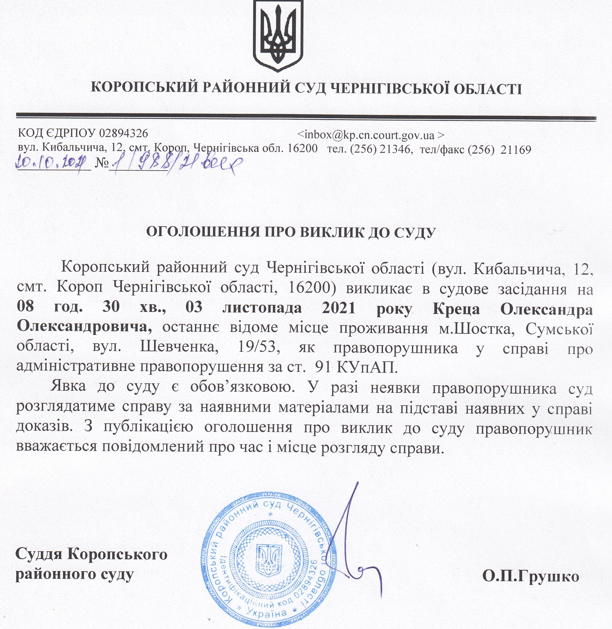 Оголошення про виклик до суду Креца О.О.