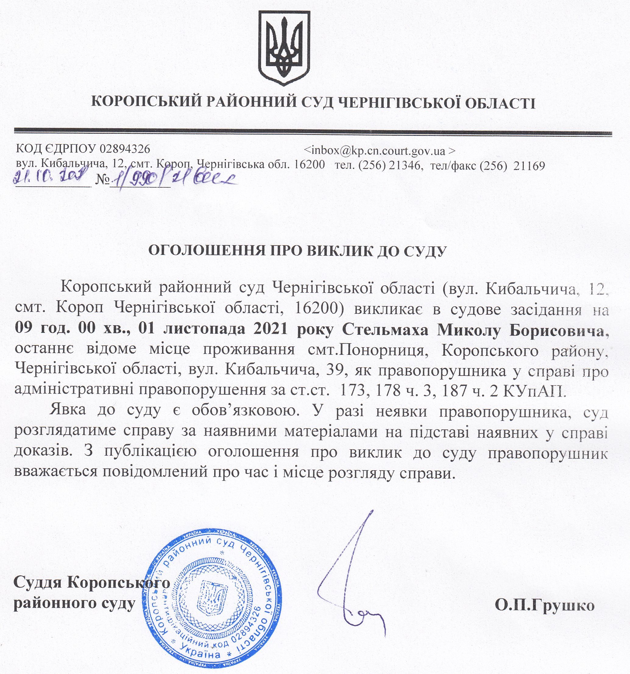 Оголошення про виклик до суду Стельмаха М.Б.