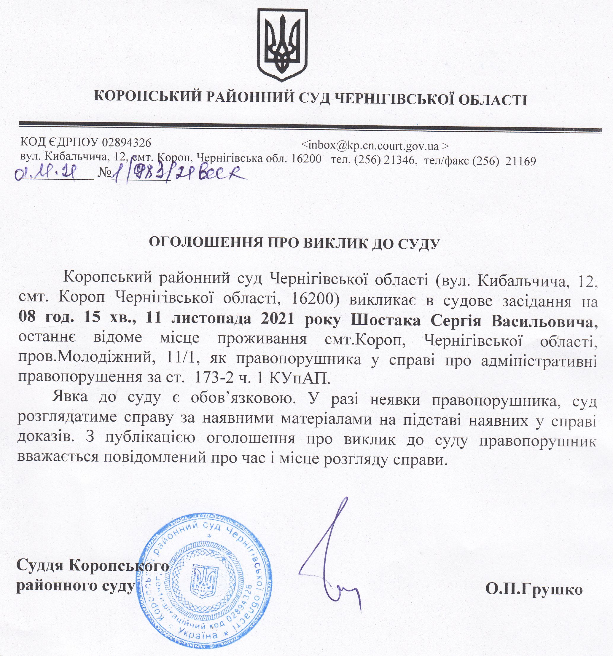 Оголошення про виклик до суду Шостак С.В.
