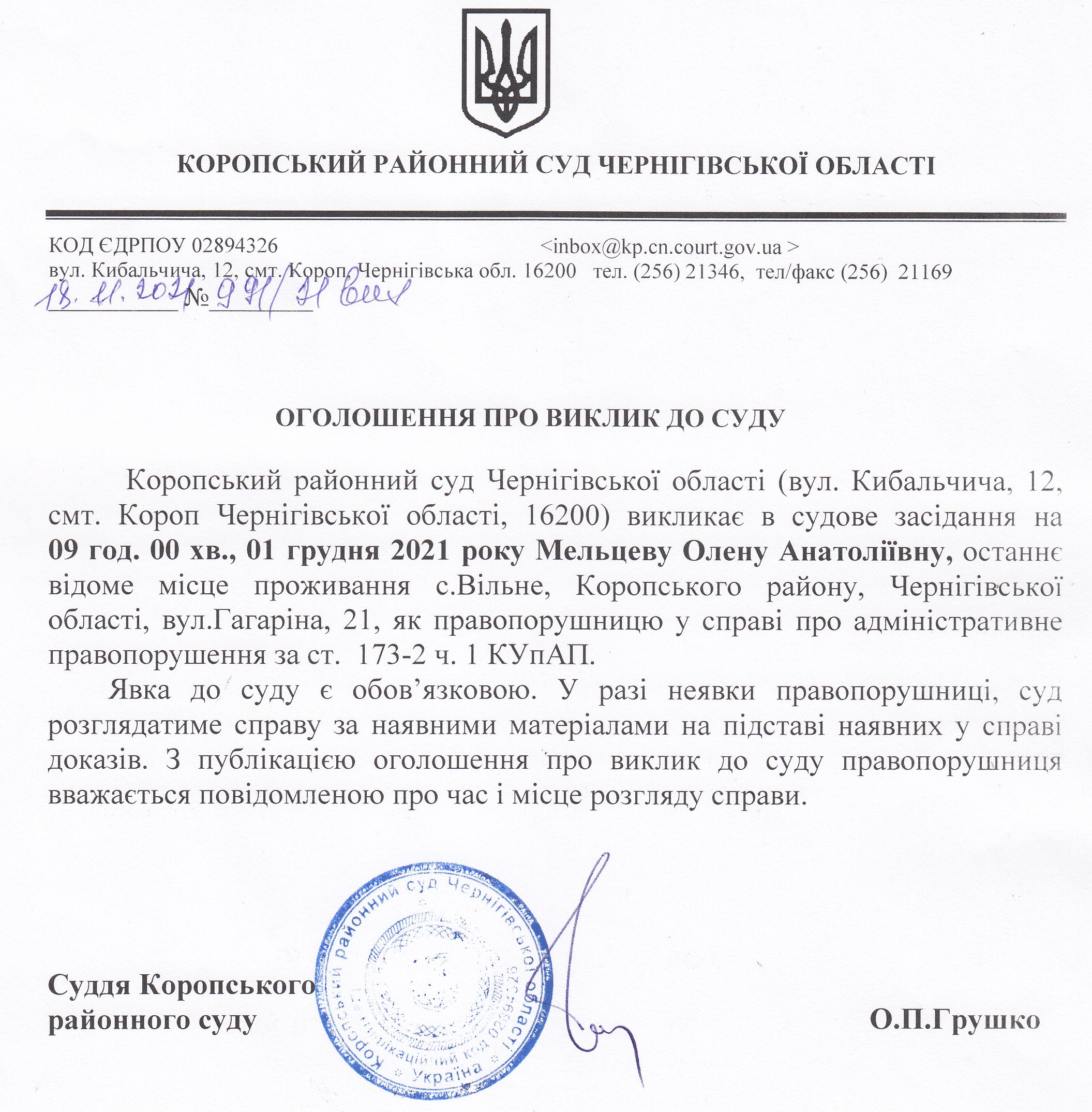 Оголошення про виклик до суду Мельцеву О.А.
