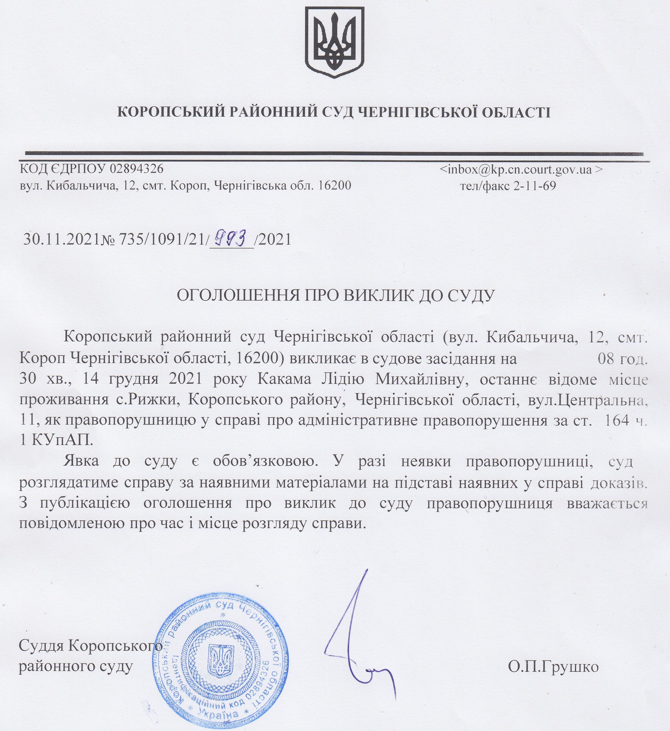 Оголошення про виклик до суду Какама Л.М.