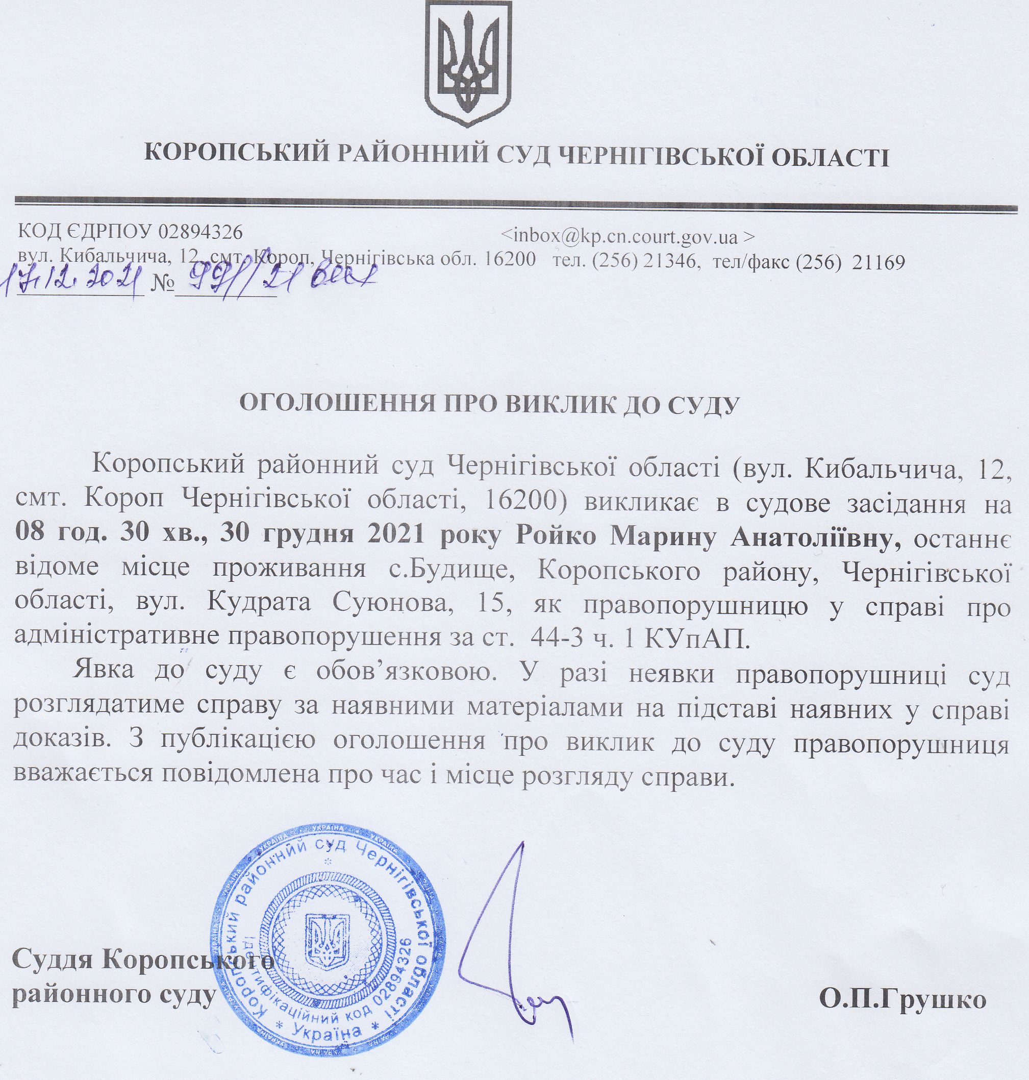 Оголошення про виклик до суду Ройко М.А.
