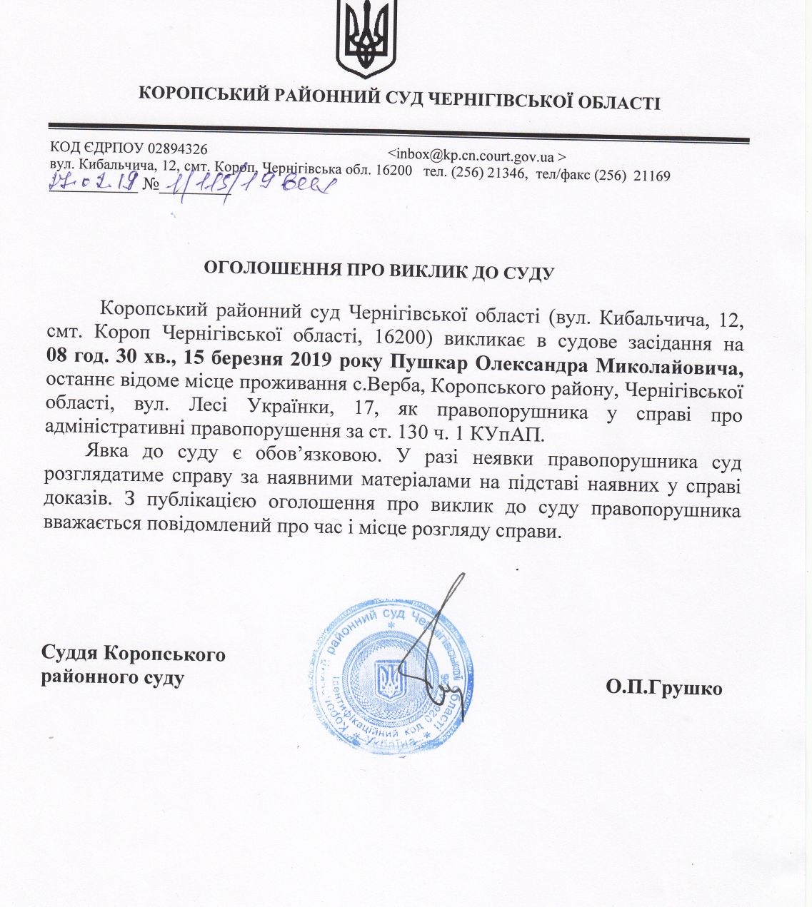 Оголошення про виклик до суду Пушкар О.М.