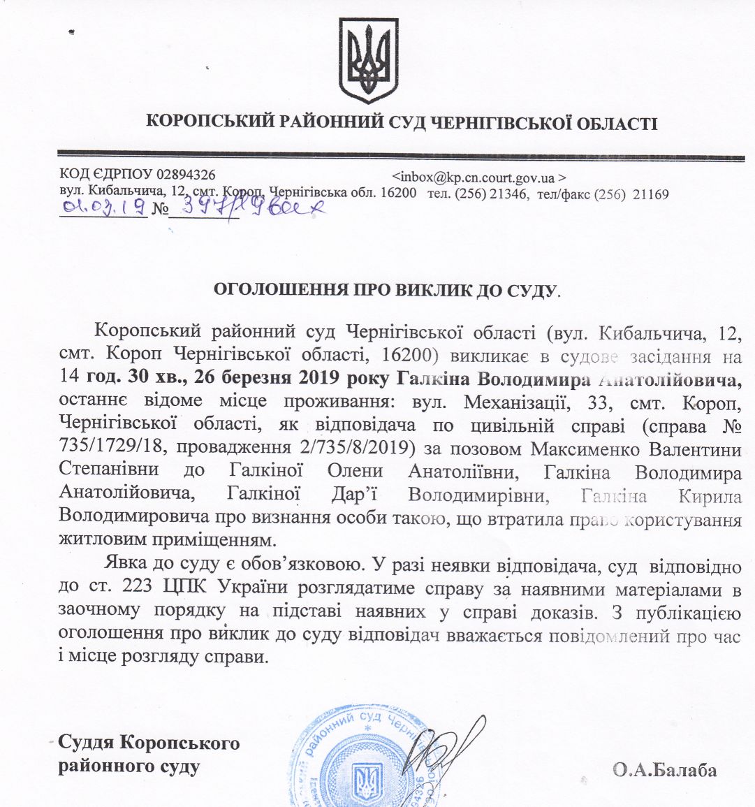 Оголошення про виклик до суду Галкінку В.А.