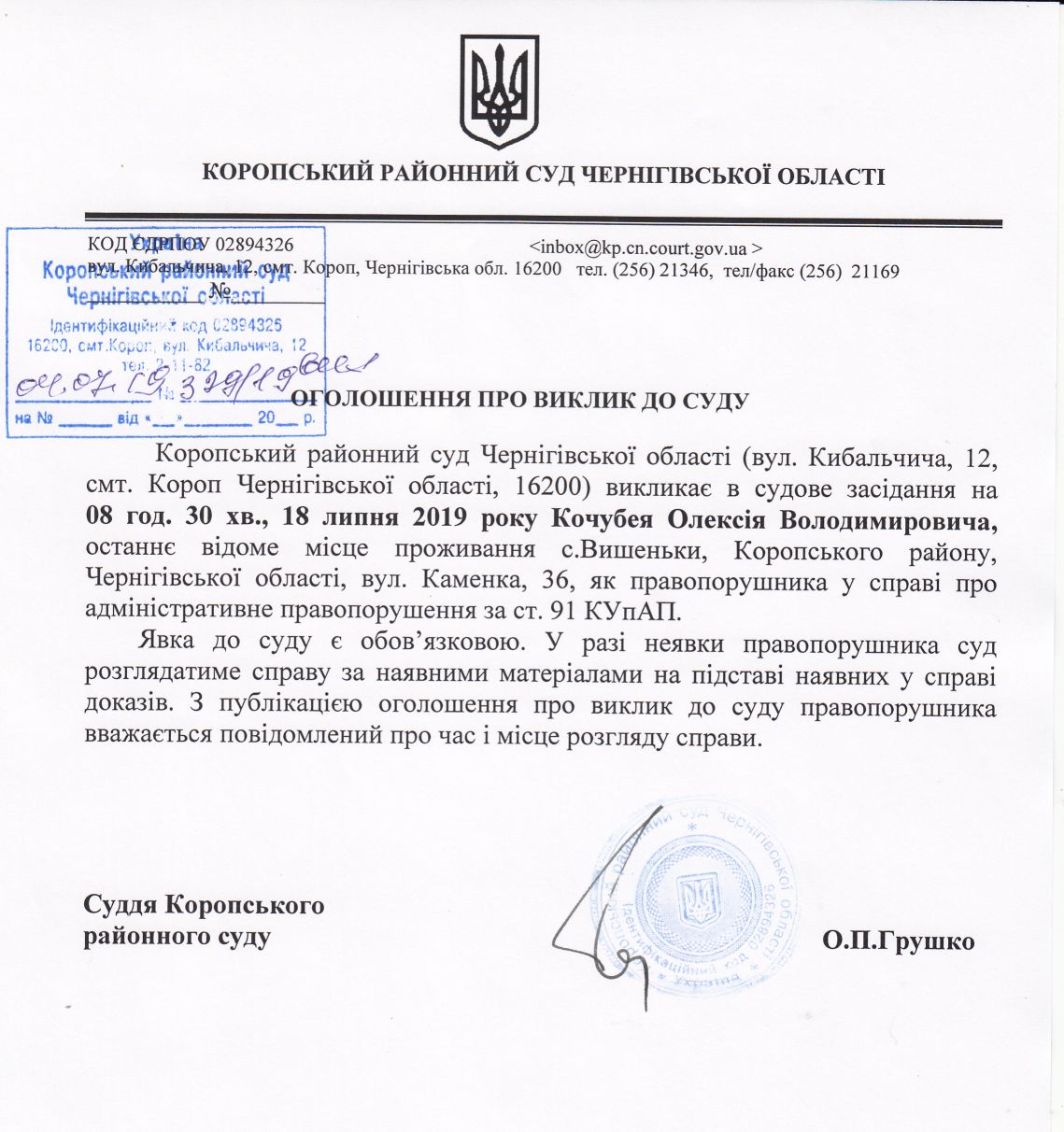Оголошення про виклик до суду Кочубей О.В.