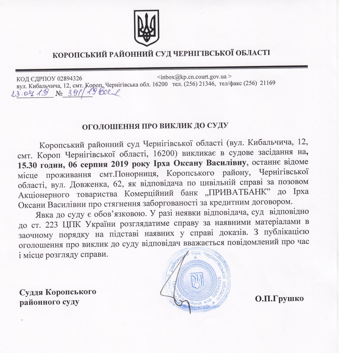 Оголошення про виклик до суду Ірха О.В.
