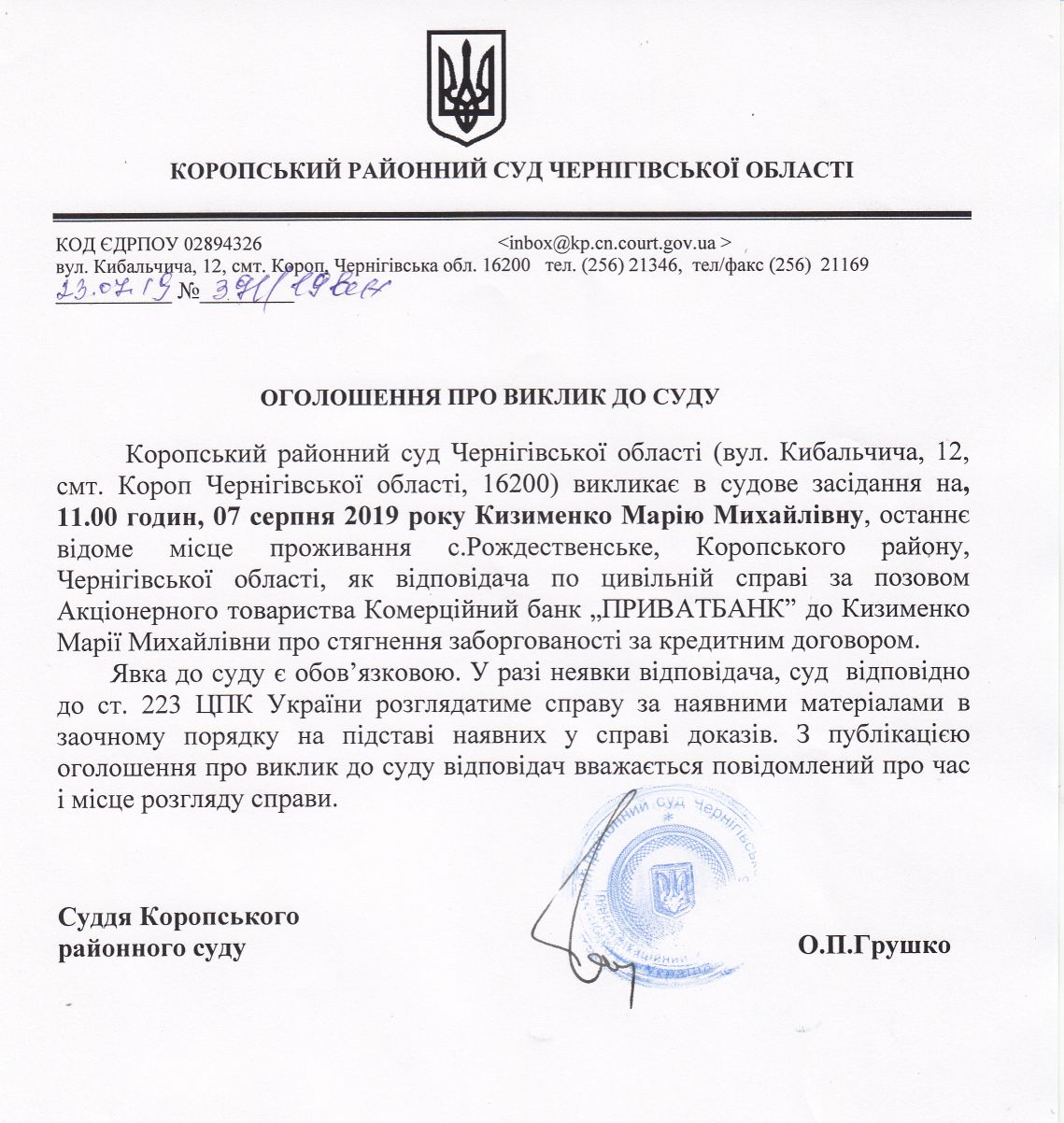 Оголошення про виклик до суду Кизименко М.М.