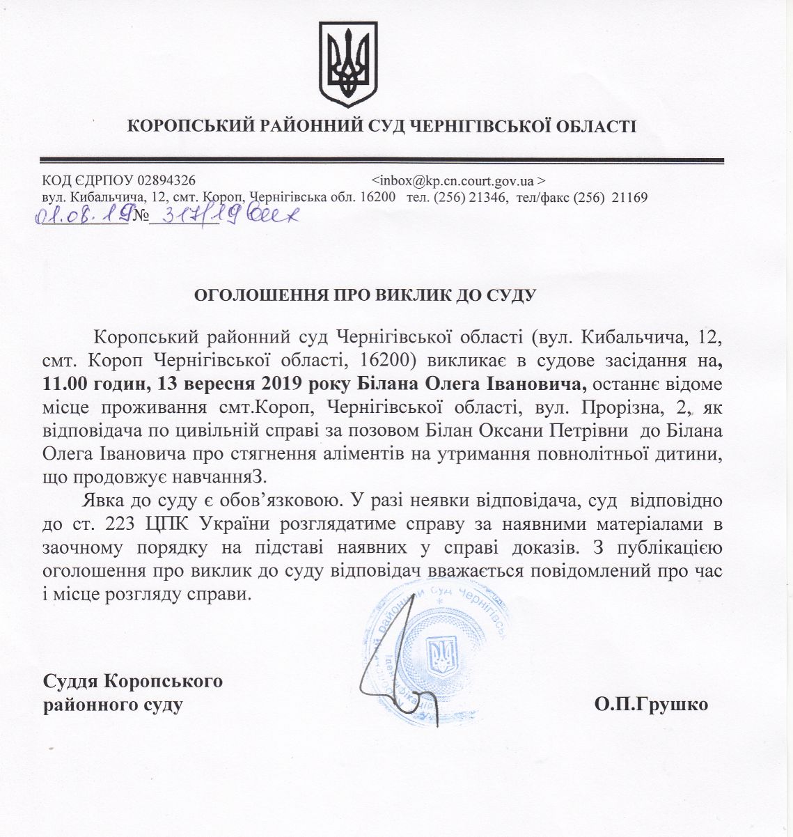 Оголошення про виклик до суду Білана О.І.
