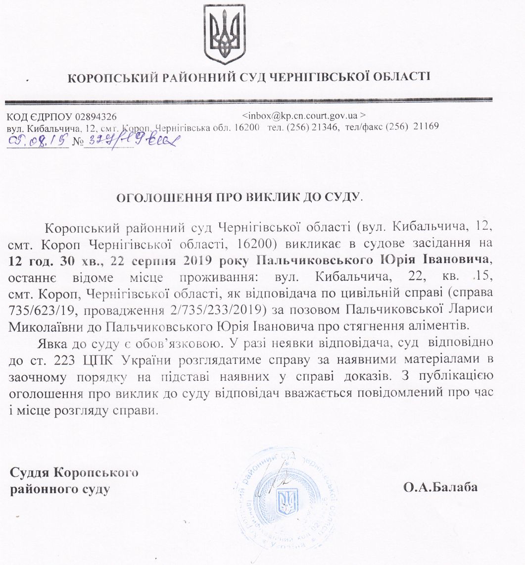 Оголошення про виклик до суду Пальчиковського Ю.І.