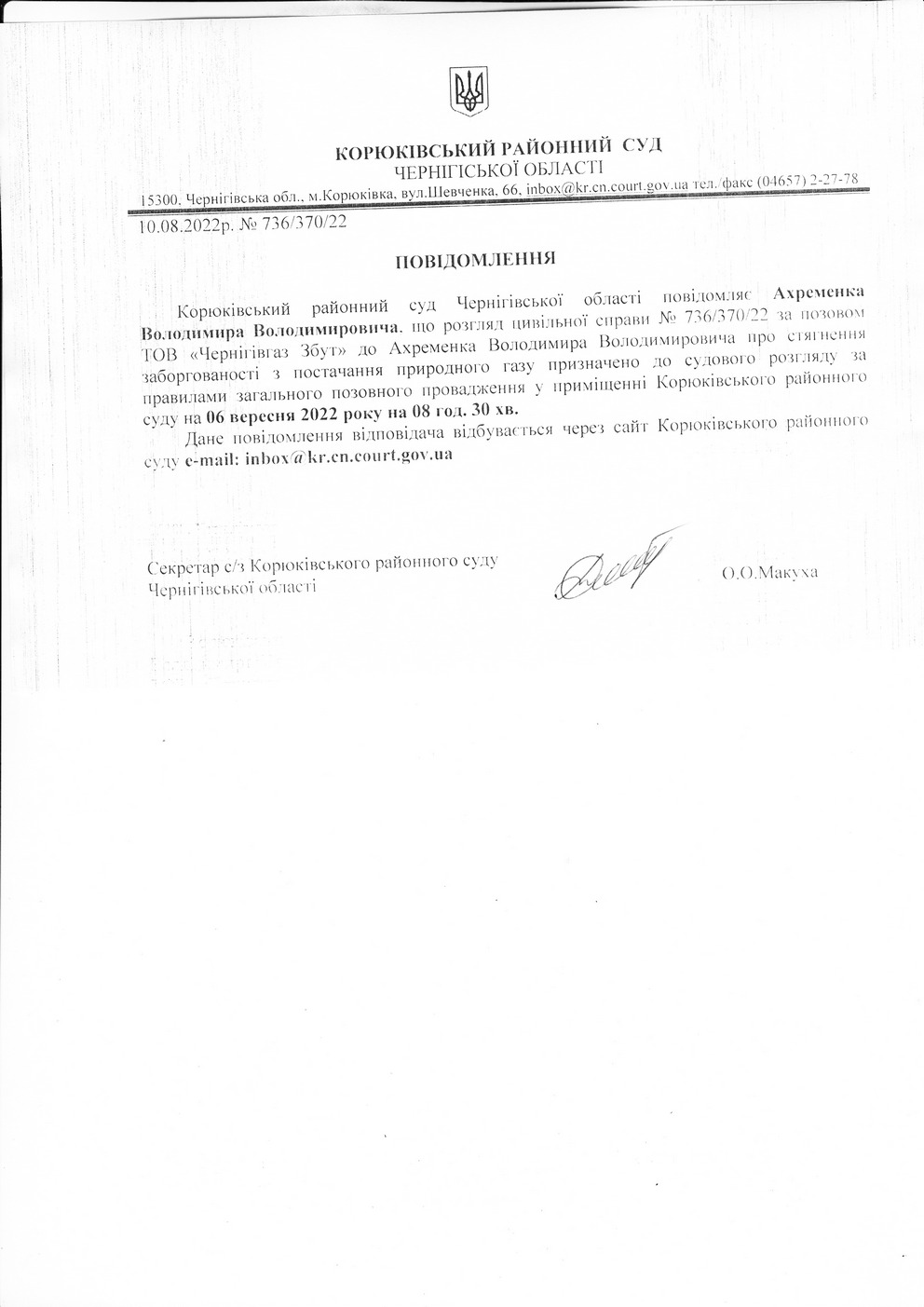 Повідомлення від 10.08.2022 про виклик до суду Ахременка Володимира Володимировича