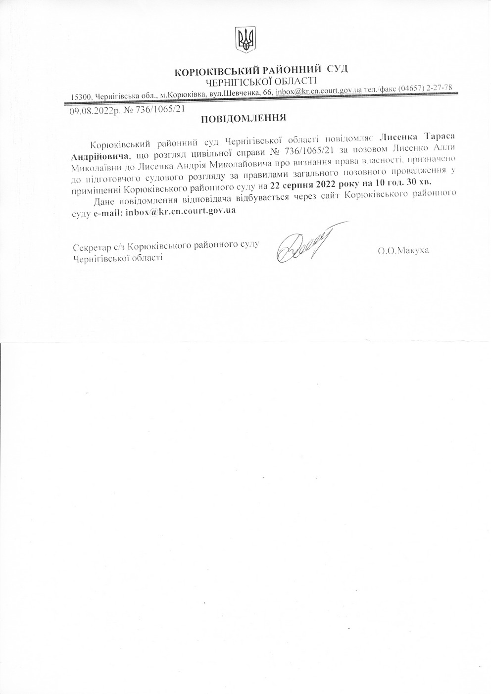 Повідомлення від 09.08.2022 про виклик до суду Лисенка Тараса Андрійовича